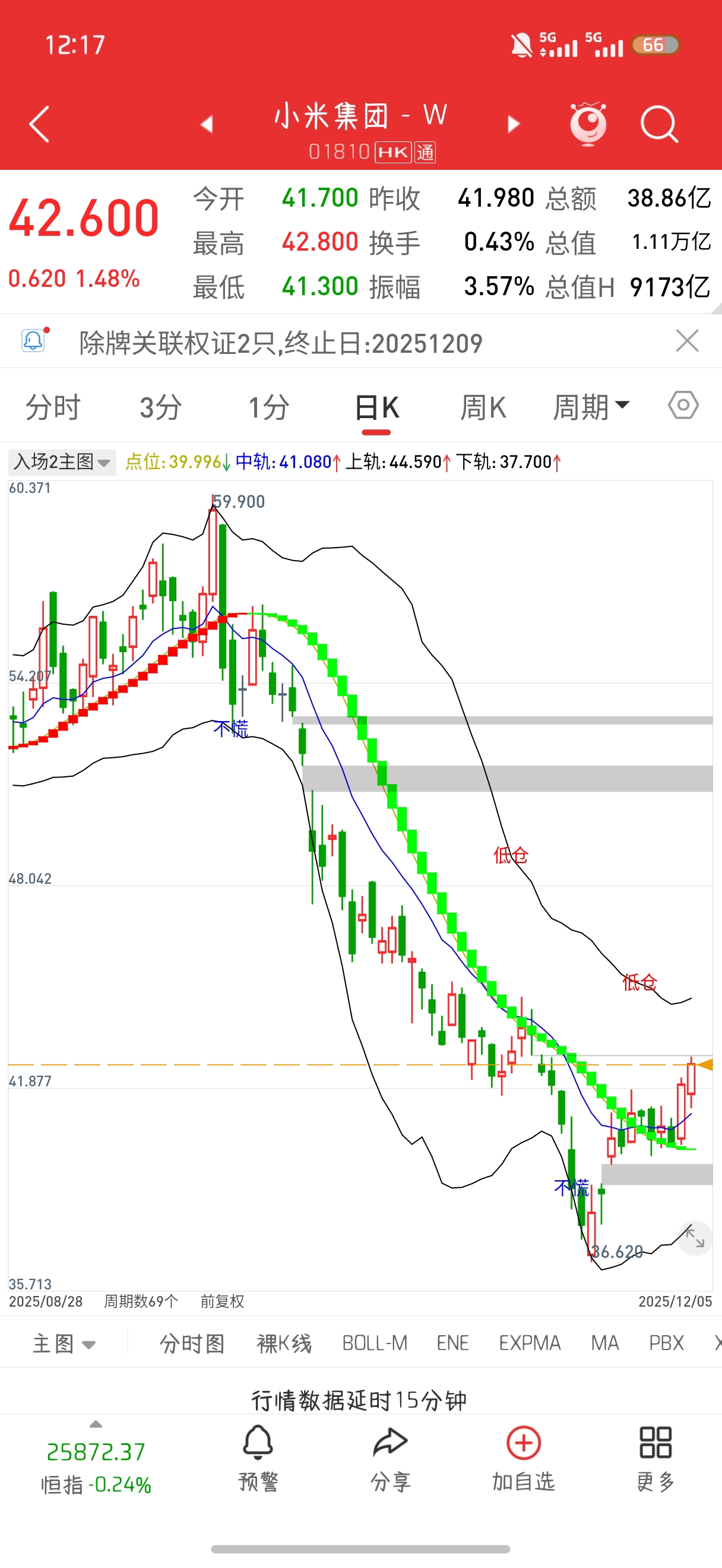 $小米集团-W(HK|01810)$ 小米昨天给了一个兄弟建议,可以买入。日线上涨完备,只需要在分钟图里找出现低仓提示的入场点即可。