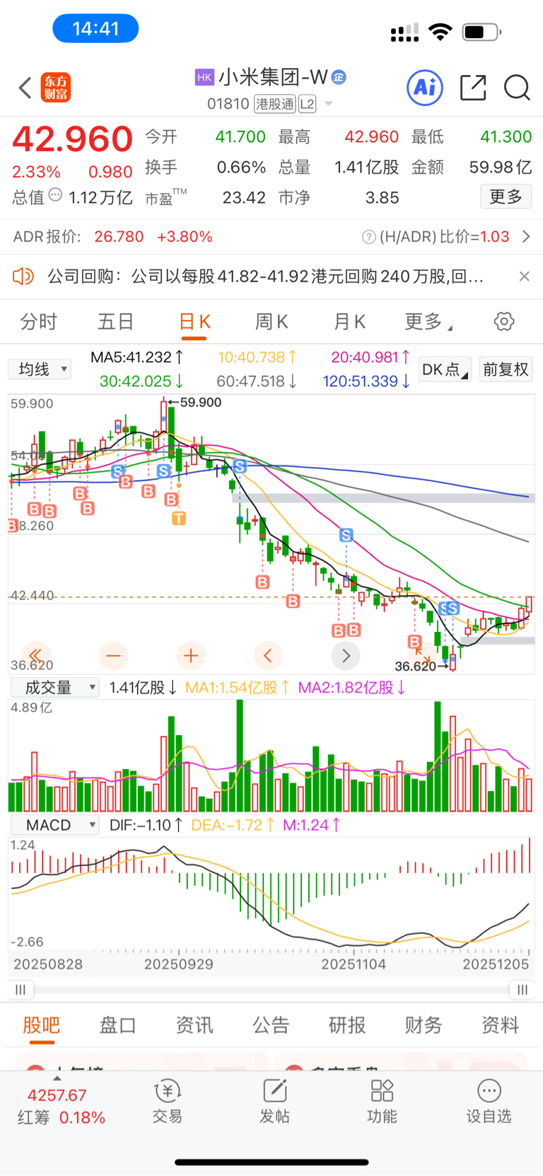 $小米集团-W(HK|01810)$ 逃命在最低点。1个月时间每天1-2万亏。受不了了你就涨了