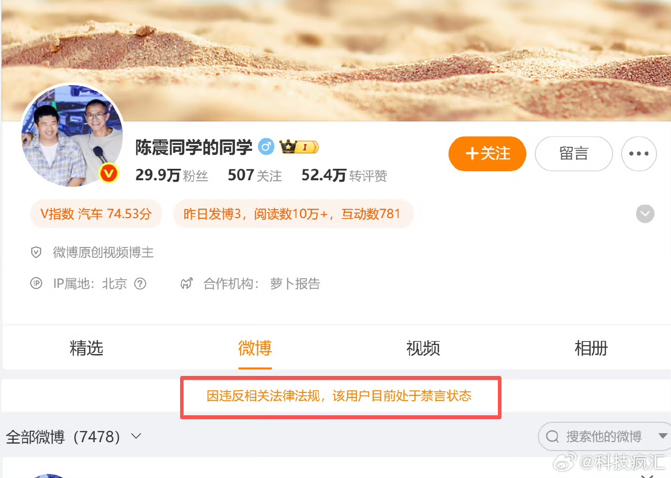 不管出于什么原因,陈震小号也被封了本身么得黑,值得点赞