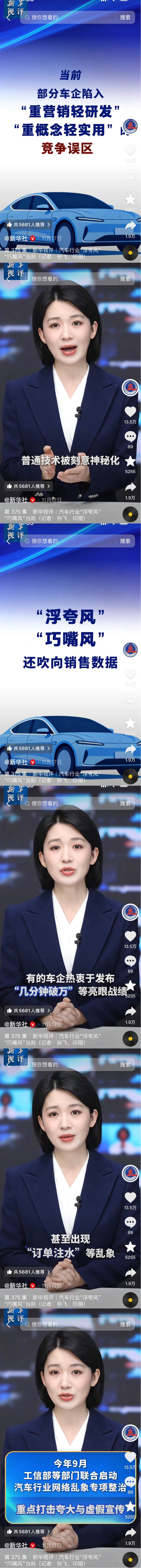 新华视评:当前部分车企陷入“重营销轻研发"“重概念轻实用"的竞争误区。今年9月工