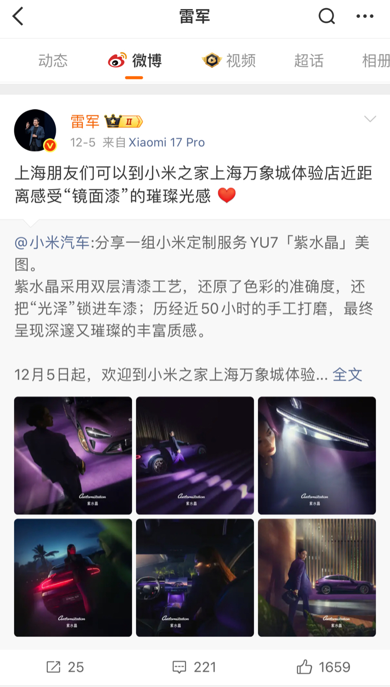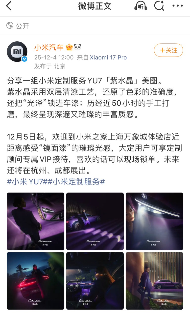12月5日,雷军在微博向上海用户发出邀请:“可以到小米之家上海万象城体验店近距离感受‘镜面漆’的璀璨光感”——这抹让雷军亲自站台的“紫水晶”,正是小米YU7定制版的新配色:从调色到成品,它靠的不是流水线的机械臂,而是近50小时的手工打磨,以及双层清漆工艺锁住的光泽。