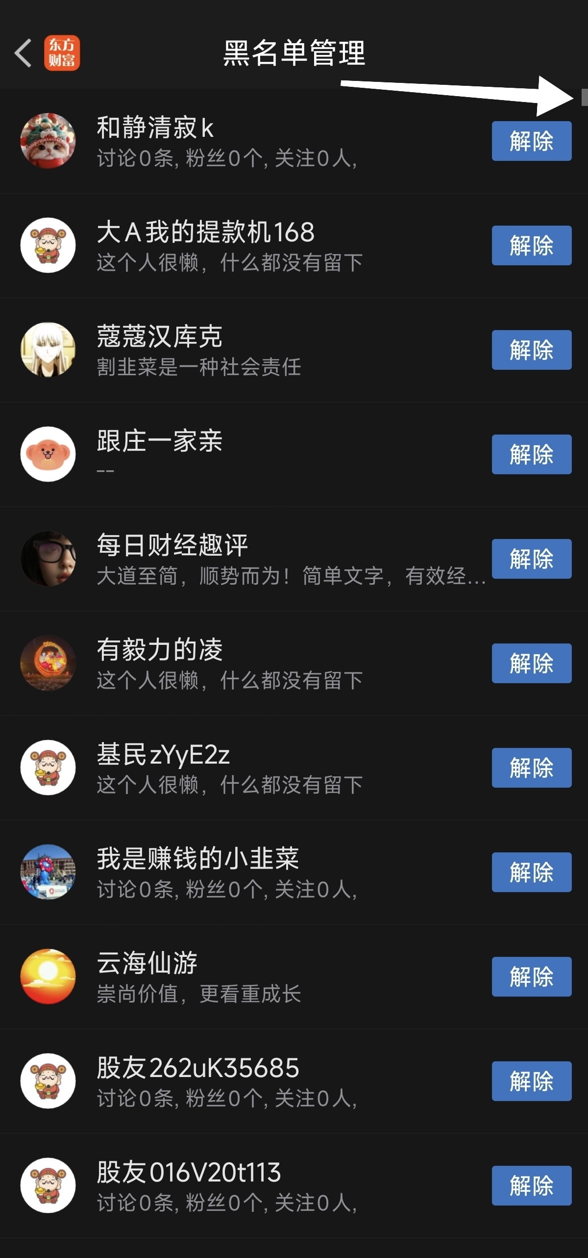 每天打开东财第一件事就是一顿拉黑,那叫一个爽啊,今天打开一看翻页下拉柱都缩成一点