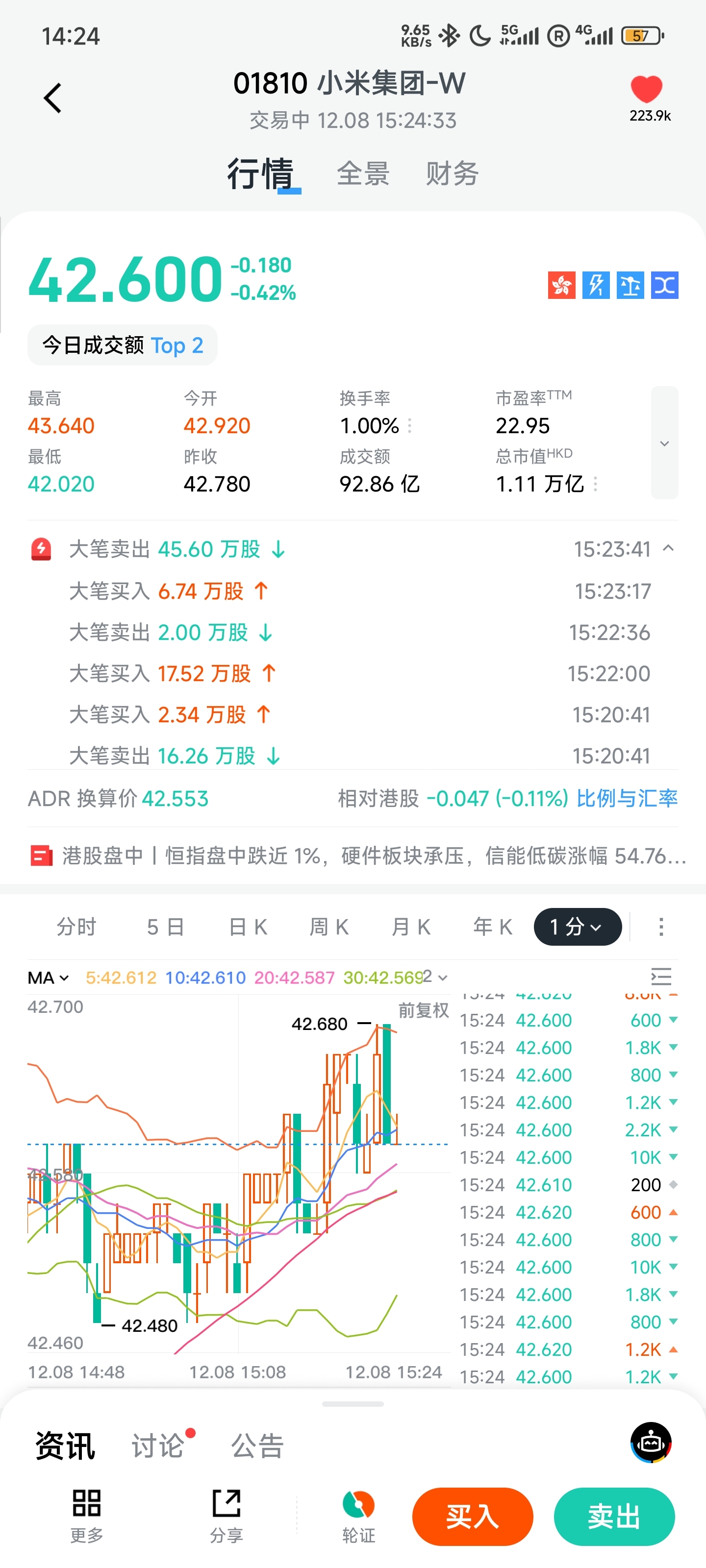 $小米集团-W(HK|01810)$ 股友真有实力,动不动就是几百万几千万的买卖。