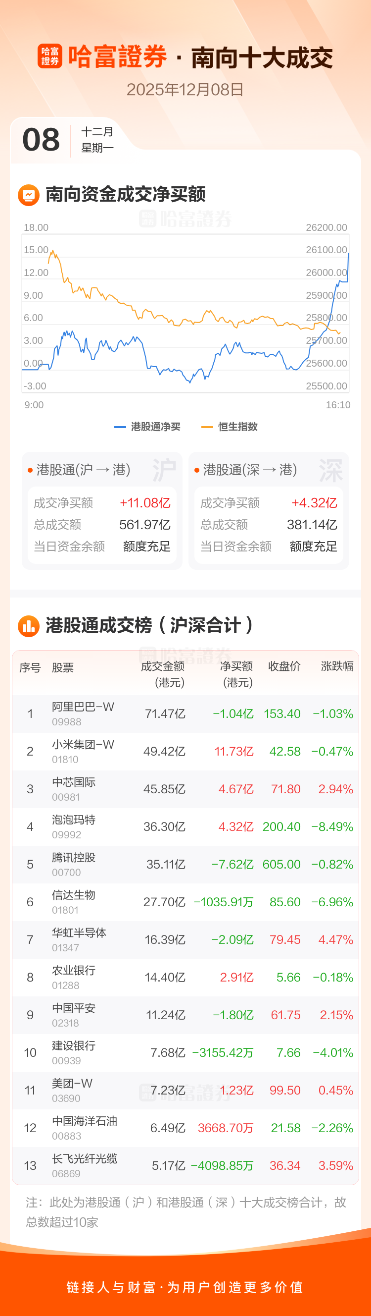 恒生指数12月8日跌1.23%,收报25765.36点。南向资金今日净买入港股15.40亿港元。南向资金今日成交额943.11亿港元,港股大市成交2062.30亿港元。