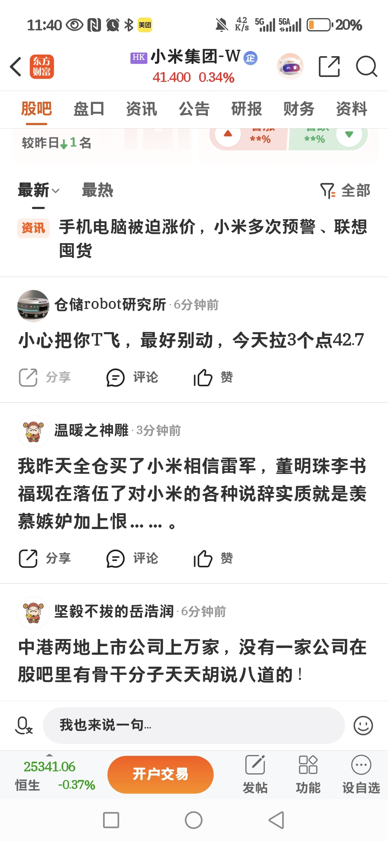 $小米集团-W(HK|01810)$ 今天股吧黑子好像都不再叫,不知道怎么回事,截图于11:41