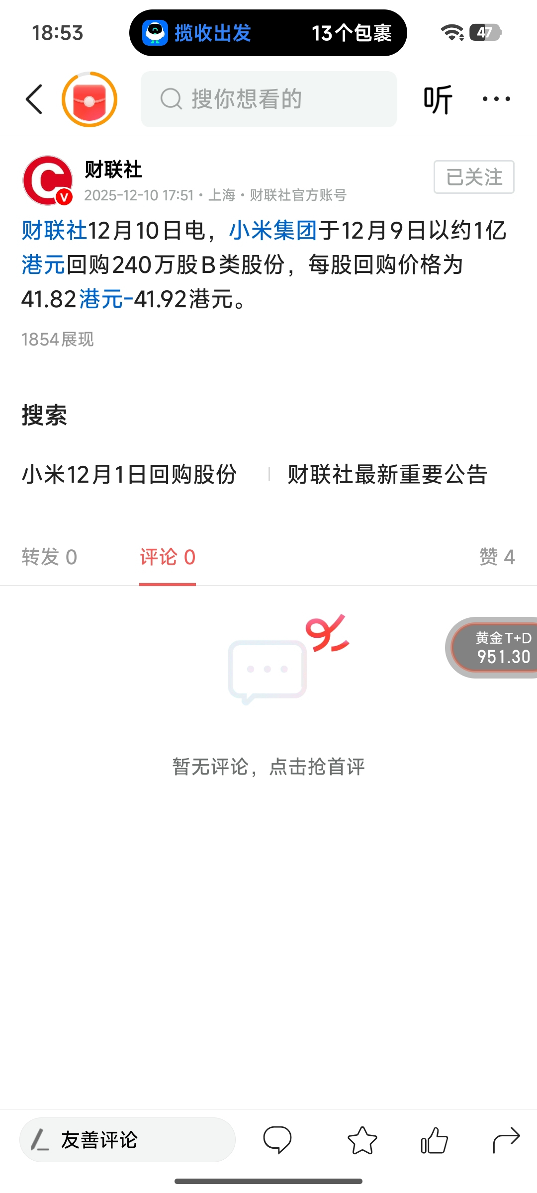 $小米集团-W(HK|01810)$ 今天的回购份额来了,1个亿港币