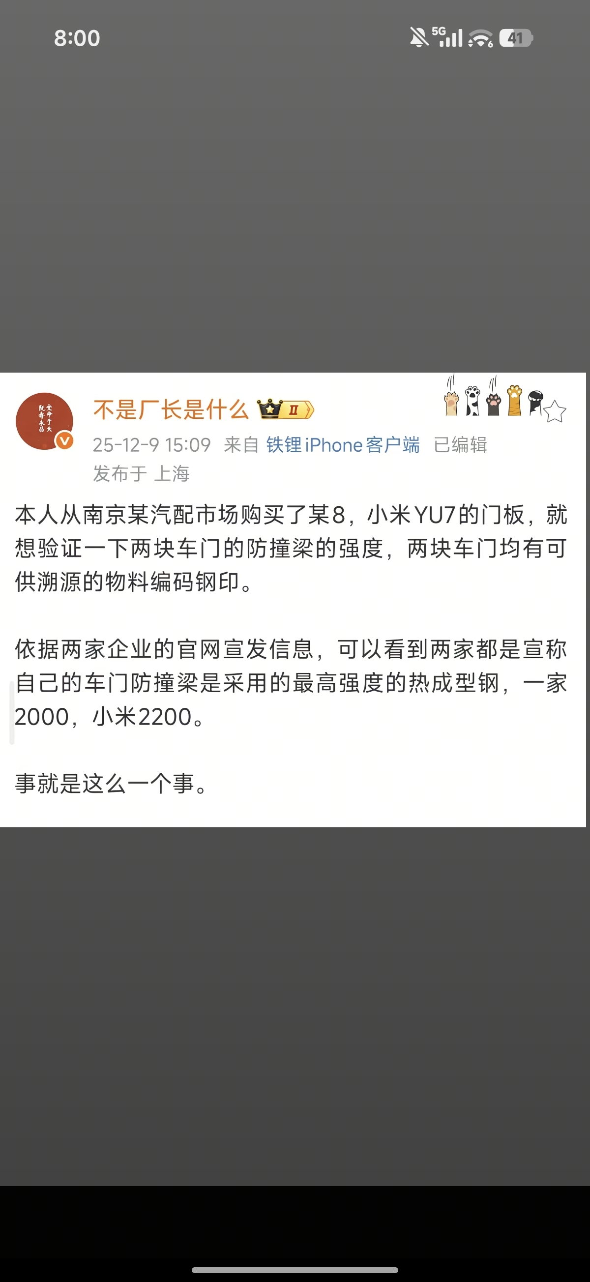 $小米集团-W(HK|01810)$ $赛力斯(SH601127)$ 能不能再鹅心一点,别人同时把小米的超强钢和某小康的去检测,小米的是正常2200mpa,某小康的宣传2000mpa,实际只有1650mpa,然后发帖人被各种威胁,明眼人都知道谁搞的鬼,发短信给微博厂长,删微博等手段,小米才是最终强者,时间会给出答案的