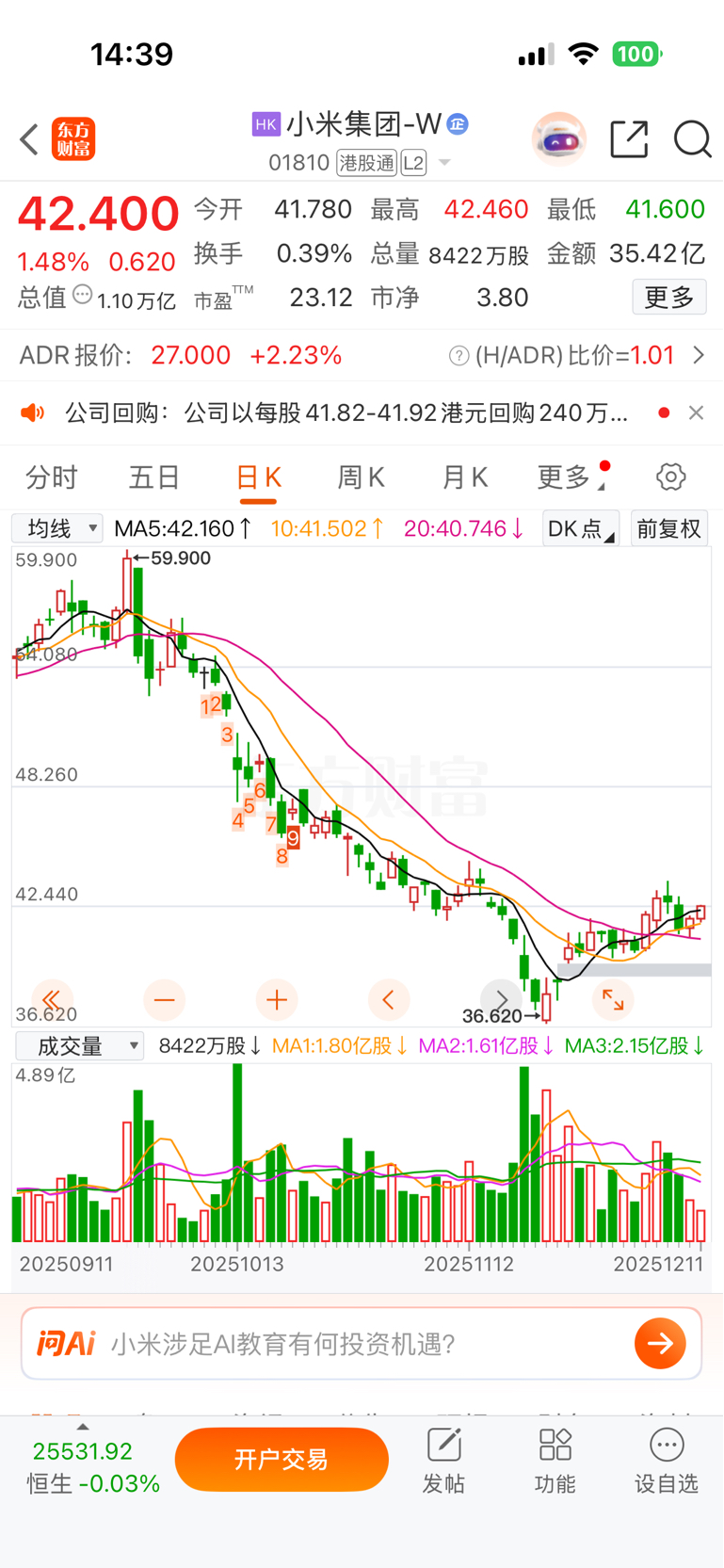 $小米集团-W(HK|01810)$ 42.44颈线位