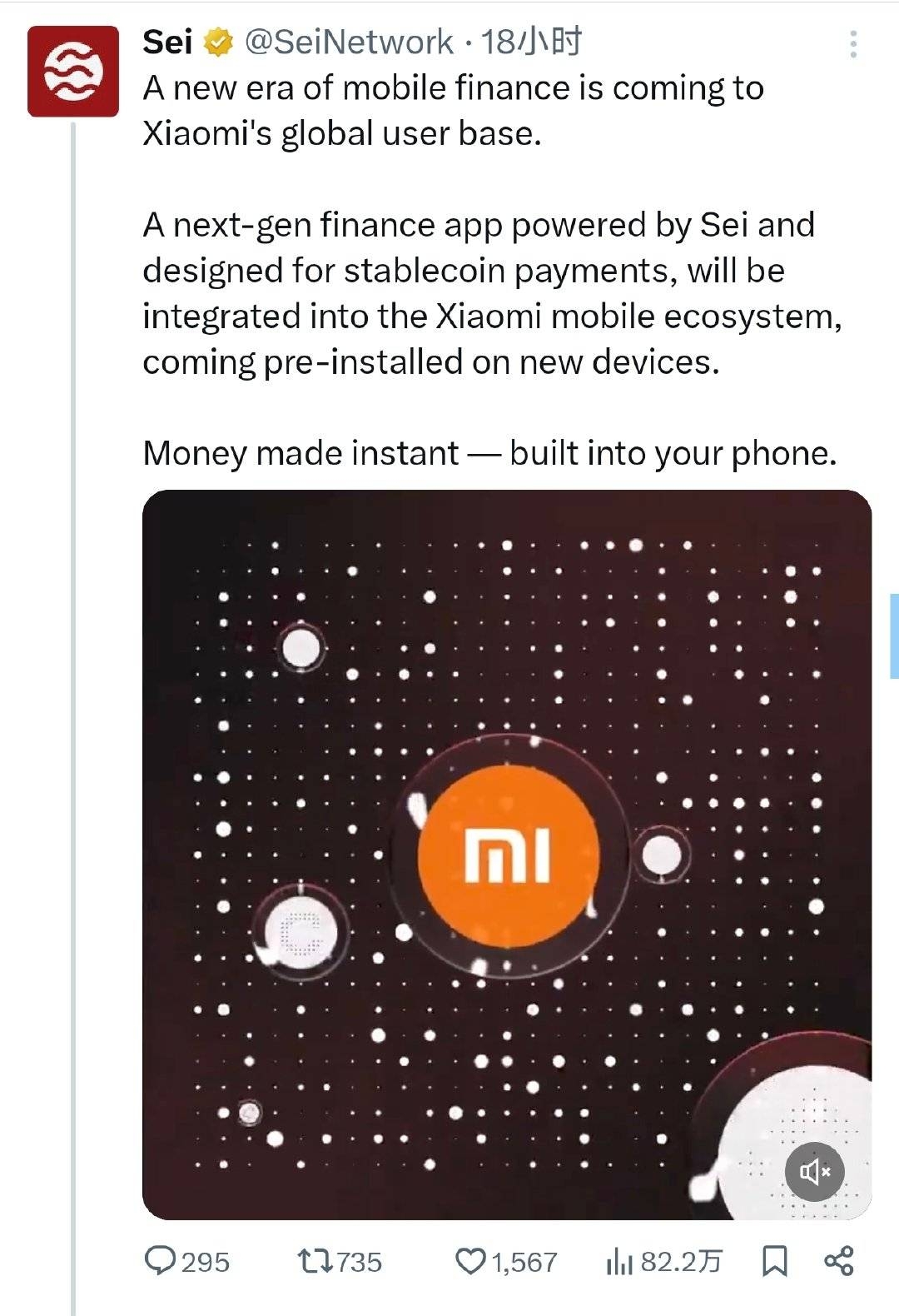 Sei @SeiNetwork · 18小时 移动金融的新时代即将登陆小米全球用户群体。 一款由Sei驱动、专为稳定币支付设计的下一代金融应用,将集成到小米移动生态系统中,并预装在新设备上。 即时赚钱——内置在你的手机中。 小米 295 735 1,567 82.2万