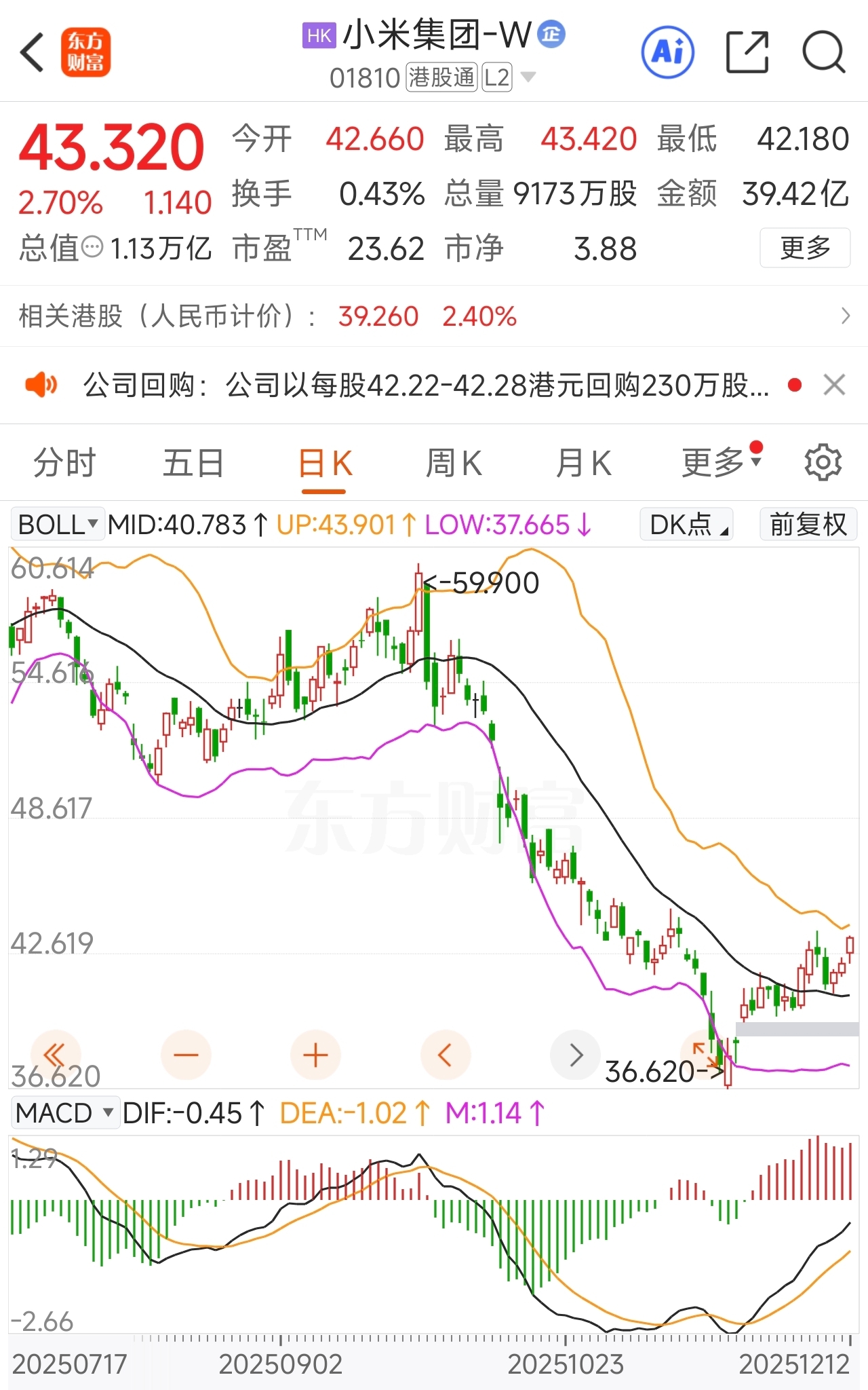 $小米集团-W(HK|01810)$ 明天摸一下44反弹结束,小米配不上这个市净率