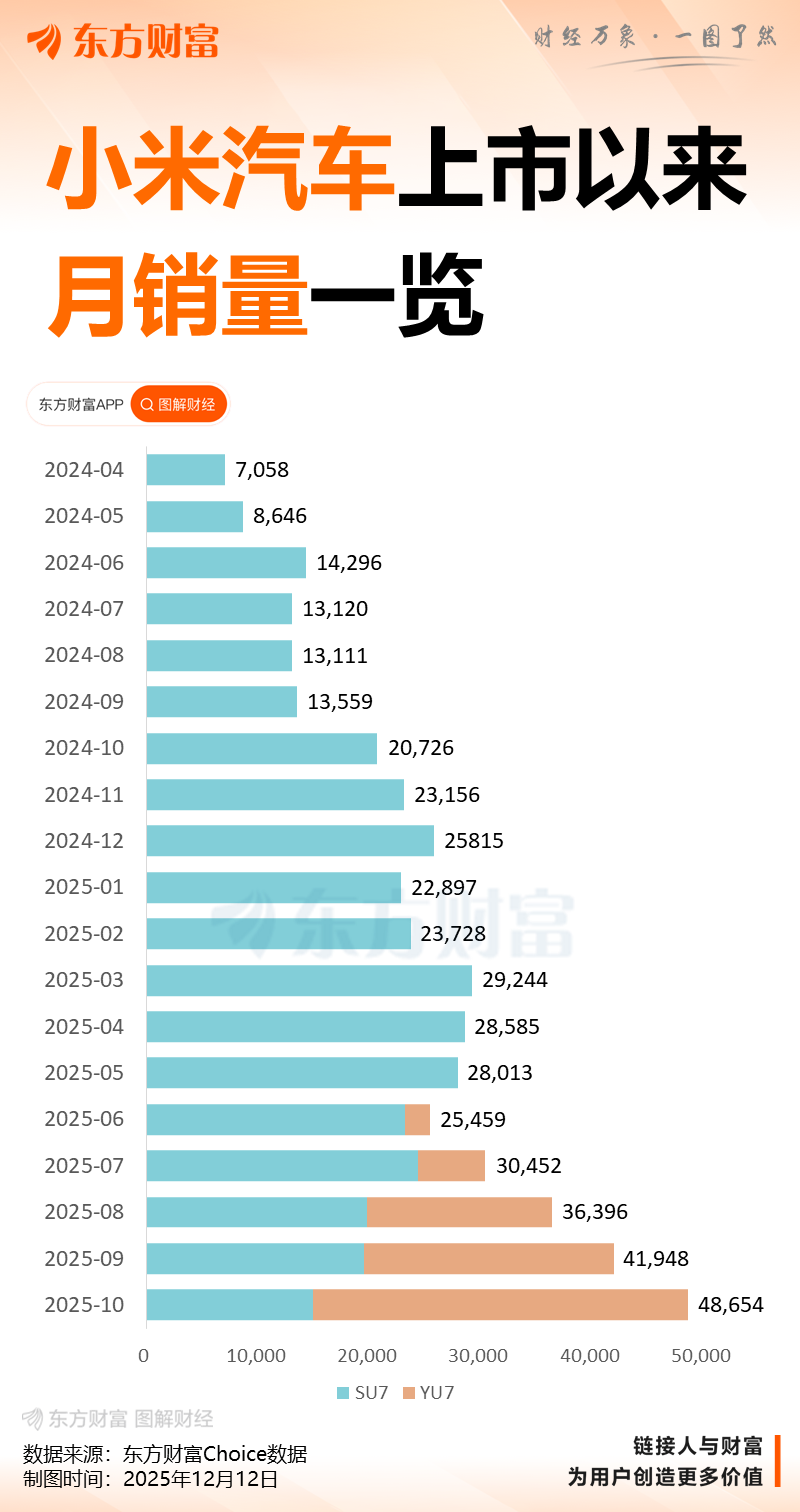 中国乘联会发布的数据显示,9月小米汽车交付量为41948辆,10月为48654辆。