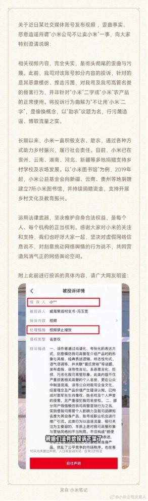 此前,小米公司就曾对该账号部分内容的投诉,针对的是其恶意模仿、捏造污蔑,对公司及公司高管名誉的侵害行为,并非针对“小米”二字或“小米”农产品的正常使用。将投诉行为曲解为“不让用‘小米’二字”,是偷换概念,以“助农”议题为名,行污蔑造谣、博取流量之实。