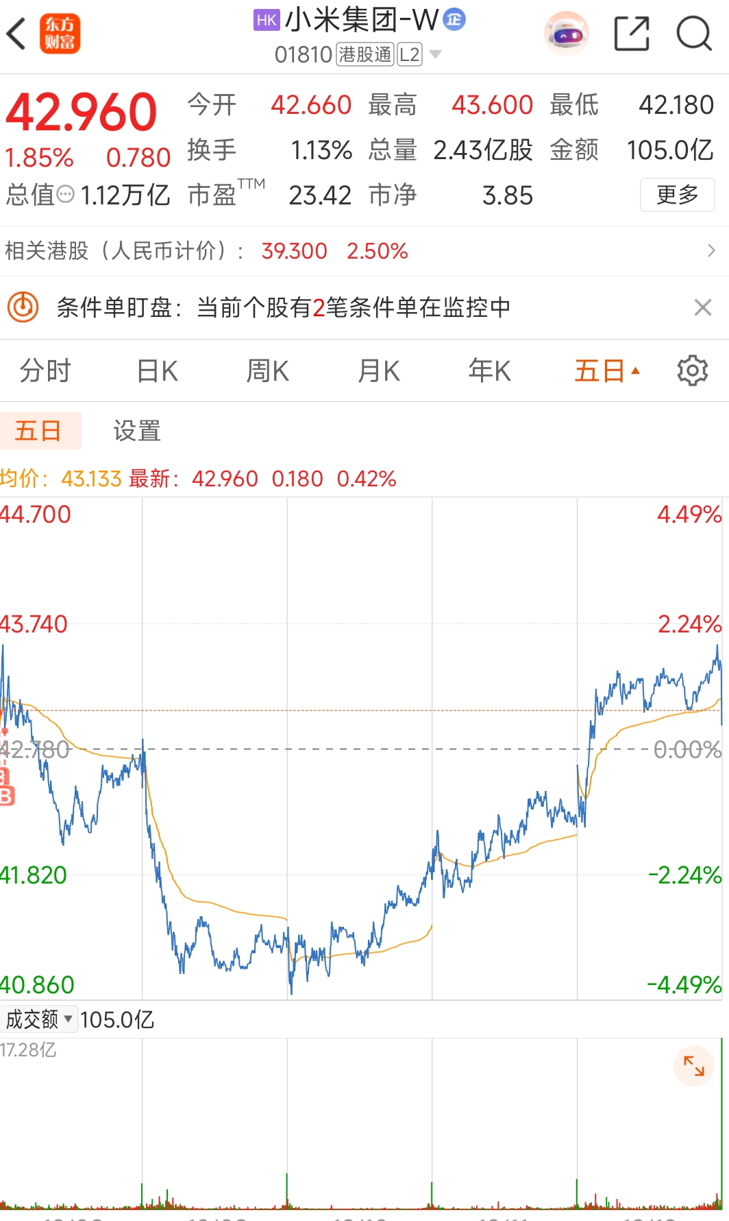 $小米集团-W(HK|01810)$ 刚买就被连续套了五天,上午以为今天要红了,结果没一点点防备,尾盘一根大阴线就这样地出现_