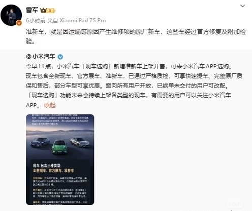 12月12日,小米汽车正式宣布在其App上架开售“准新车”,这一创新销售模式迅速引发市场关注。小米集团创始人雷军对此专门做出回应,详细解释了准新车的概念:这些车辆是因运输等原因产生维修项的原厂新车,经过官方专业修复及严格附加检验,消费者可以放心购买。