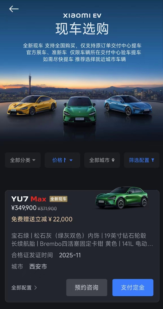 事实上,这些车的数量还是有限的。据蓝鲸记者从小米汽车销售处了解到,12月13日,SU7上架19台,YU7上架288台。后续现车还会陆续上架。