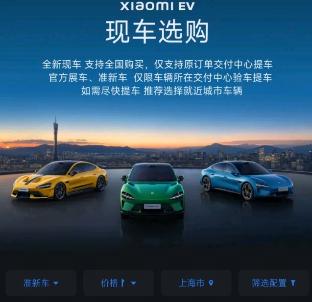 12月12日,小米汽车“现车选购”新增准新车上架开售。据介绍,所谓的“现车选购”其实包含三种类型的车辆,第一种是异常订单和用户未提车的全新现车,第二种是可能存在轻微磨损的官方展车,第三种是因运输等原因产生维修但经官方修复并检验的准新车。