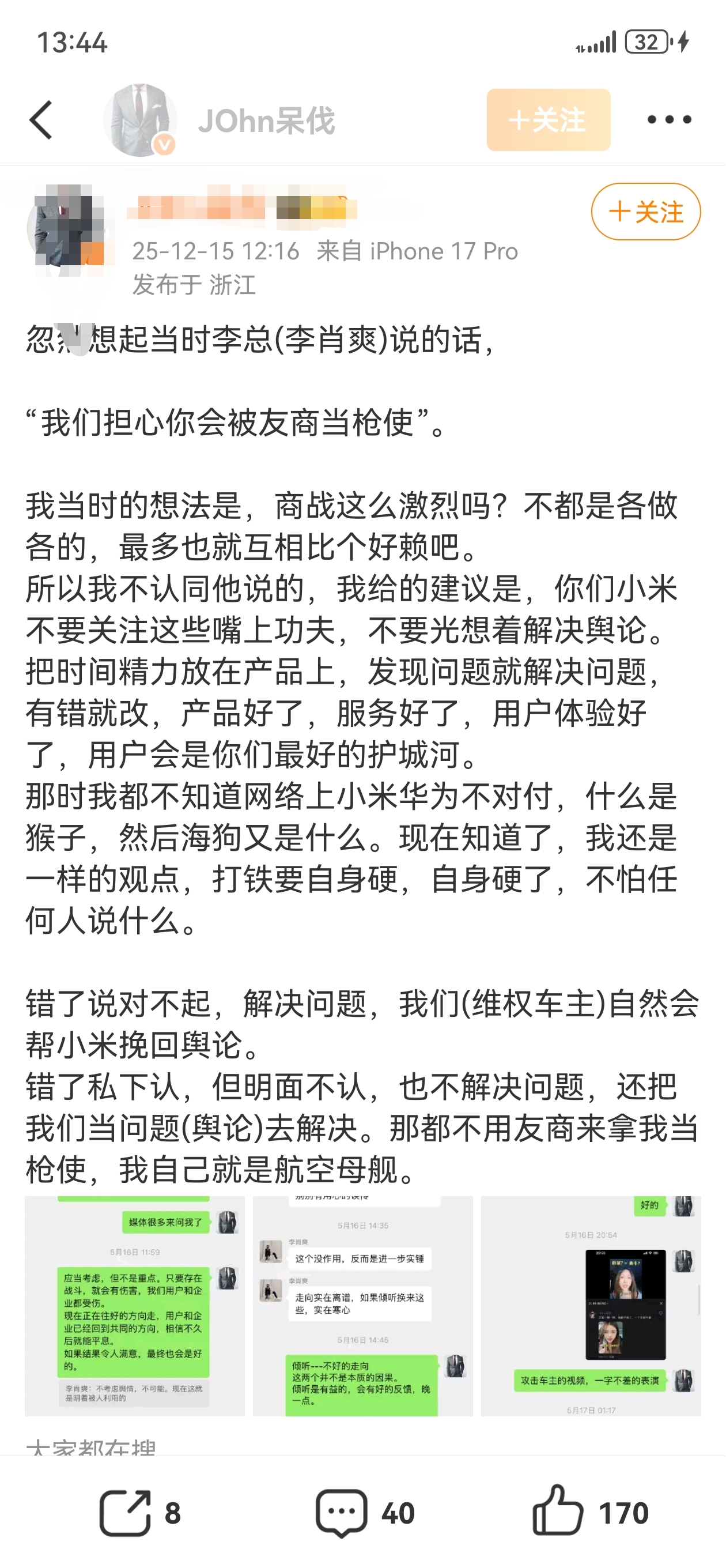 $小米集团-W(HK|01810)$ $比亚迪(SZ002594)$ 我粮一贯德行,出了问题永远是先甩锅友商、甩锅同行、甩锅自己用户!却从来不想着怎么通过自己的补救措施和技术改进解决问题才是根本。对比一下,有人黑问界尊界,无业游民用户们都是自告奋勇,自己就帮厂家把谣给辟了,而我粮这是一开始就认为自己用户被友商利用了。对比一下反差真是太大了