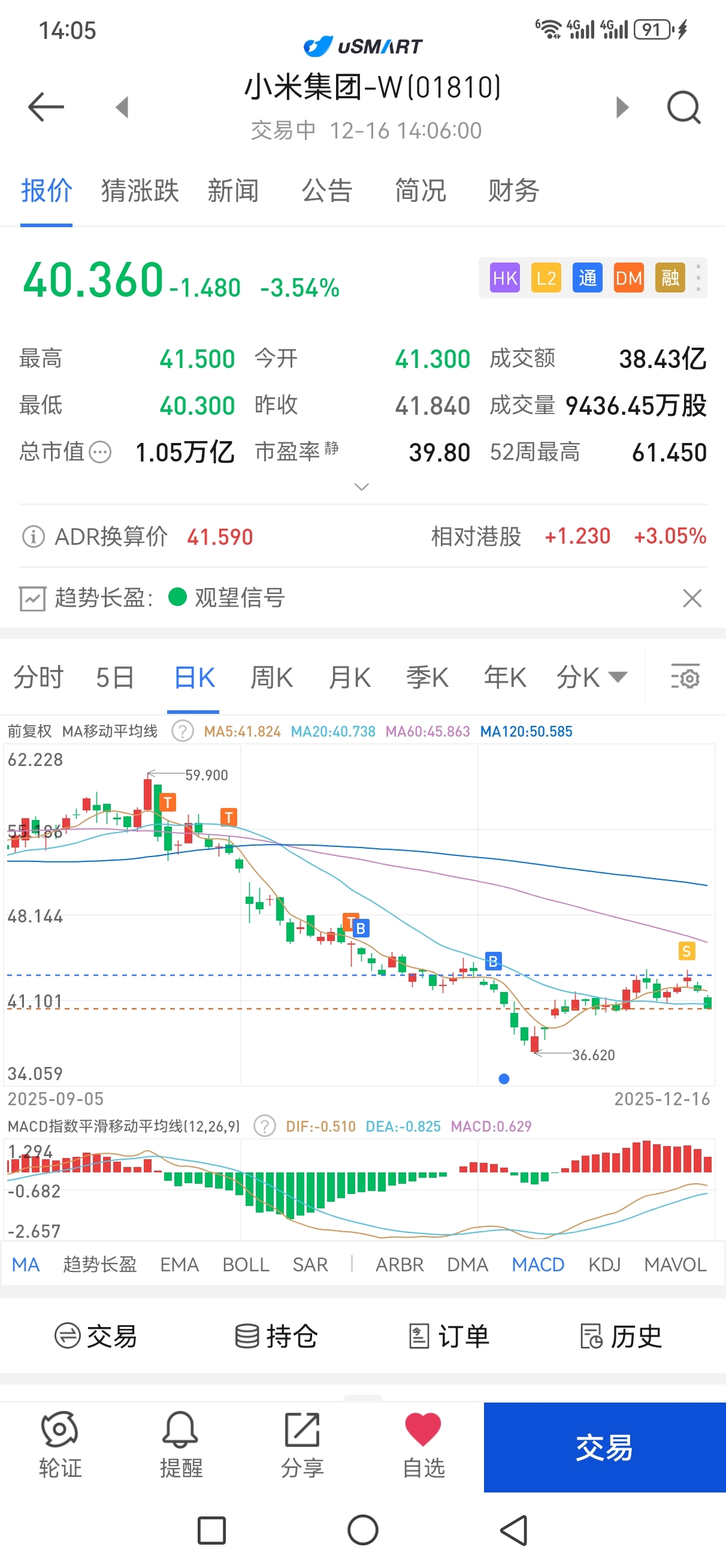 $小米集团-W(HK|01810)$ 好在周五43.3跑了。等回补缺口再接回来