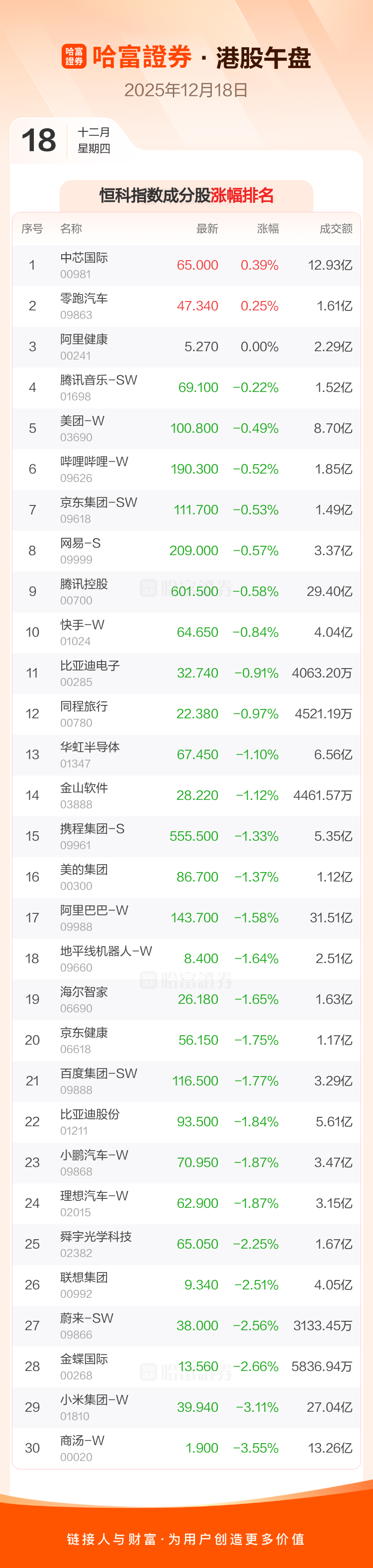 港股12月18日午盘走低,恒生指数收报25357.64点,跌111.14点,跌幅0.44%;恒生科技指数收报5389.42点,跌68.53点,跌幅1.26%。恒生指数成分股中石药集团、中通快递-W、中国石油化工股份涨幅居前,小米集团-W、泡泡玛特、龙湖集团跌幅靠前。恒生科技指数成分股中中芯国际、零跑汽车、阿里健康涨幅居前,商汤-W、小米集团-W、金蝶国际跌幅靠前。
