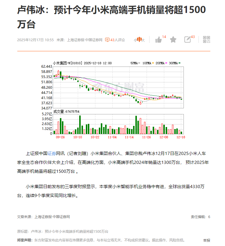 卢伟冰:预计今年小米高端手机销量将超1500万