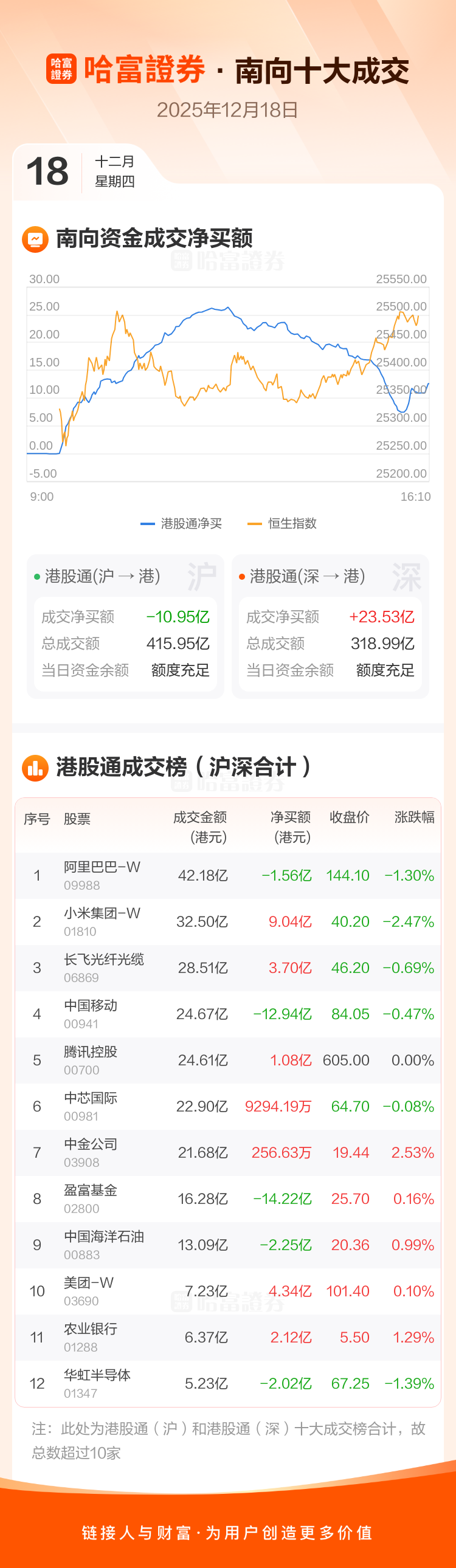恒生指数12月18日涨0.12%,收报25498.13点。南向资金今日净买入港股12.57亿港元。南向资金今日成交额734.95亿港元,港股大市成交1623.77亿港元。