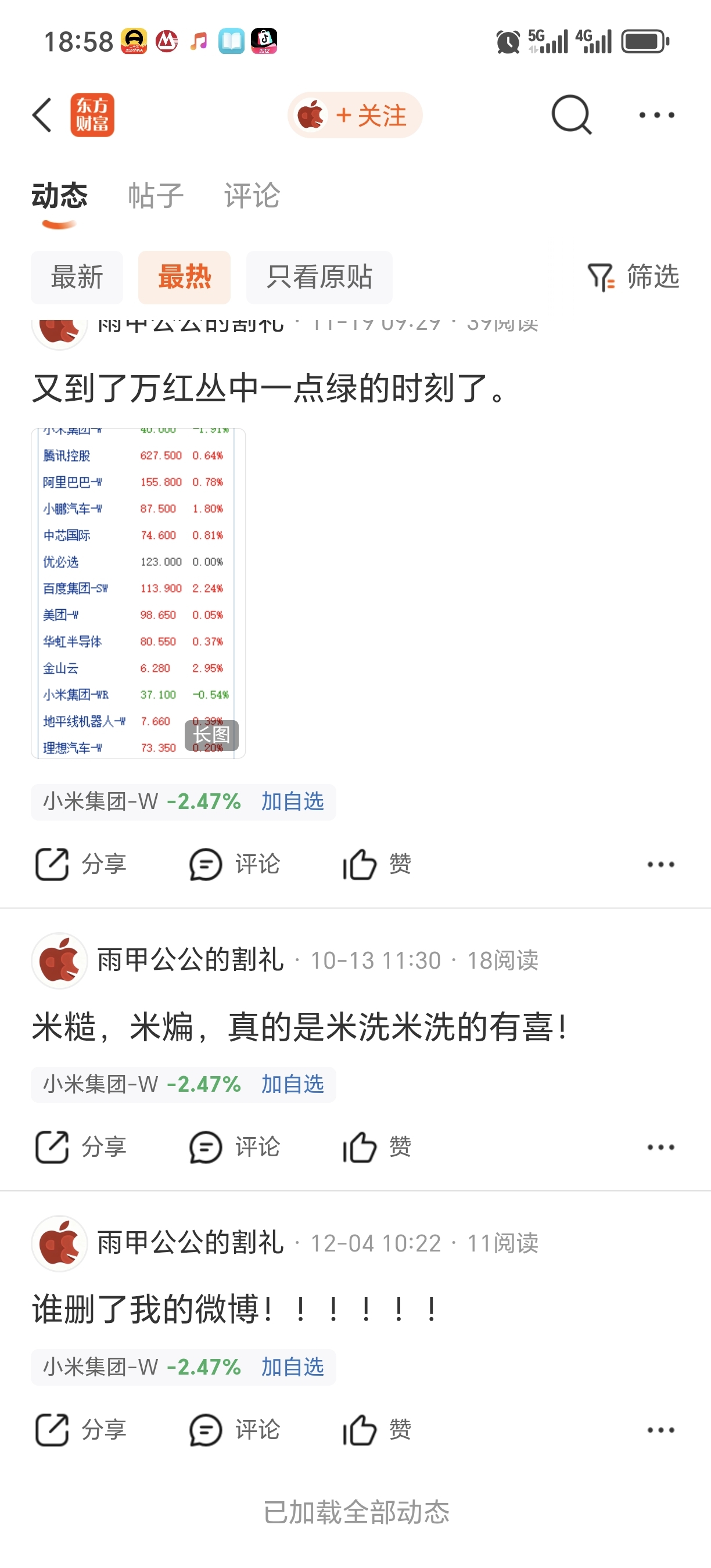 $小米集团-W(HK|01810)$ 这个b一直发啊只发小米的 。。。有点失心疯了。。。