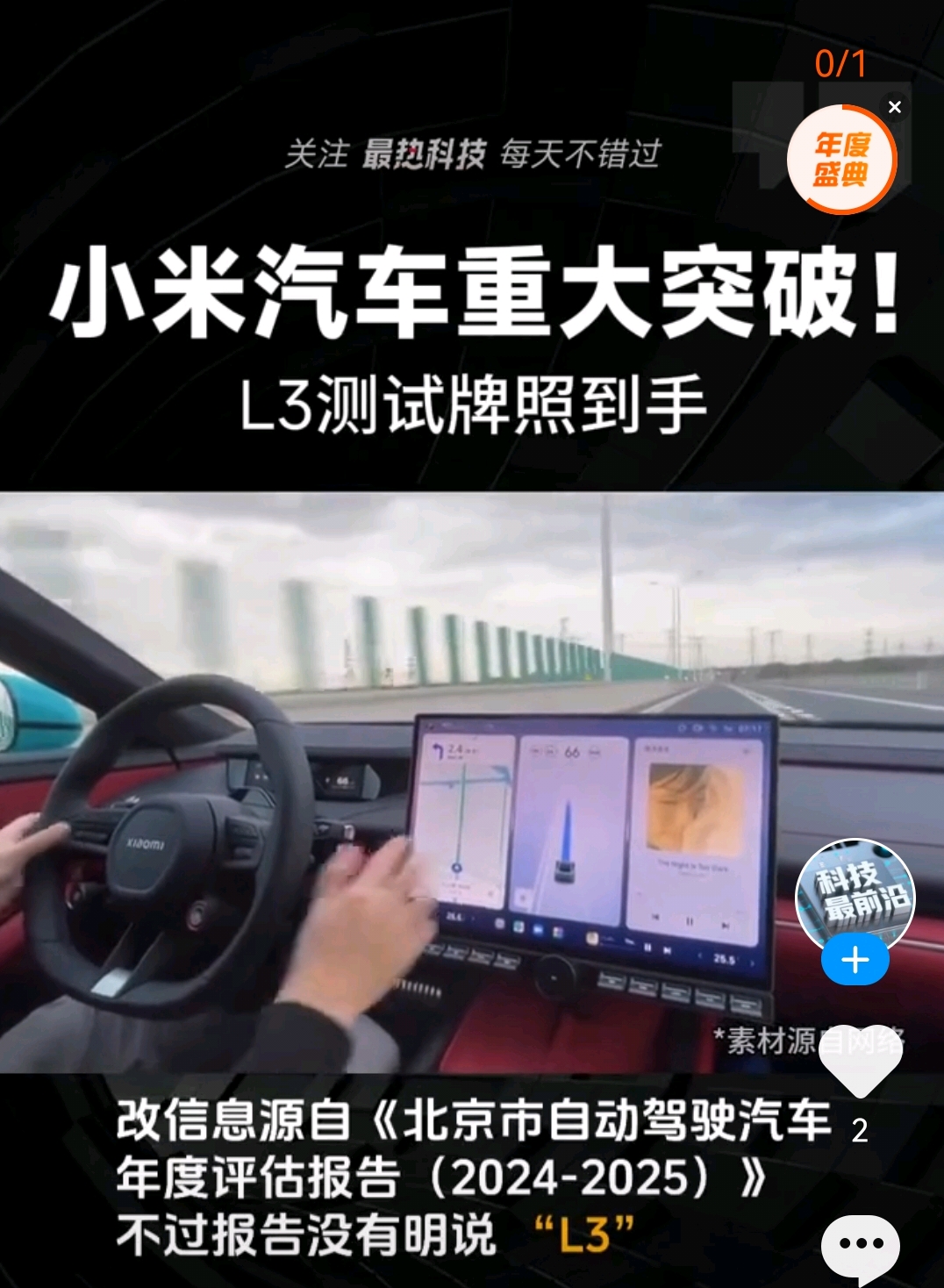 据小米12月19日的消息,小米汽车近日已在北京市获得L3级自动驾驶道路测试牌照,并持续开展了常态化L3级道路测试。根据牌照规定,其测试路段主要用于北京市智能网联汽车高快速路测试路段。