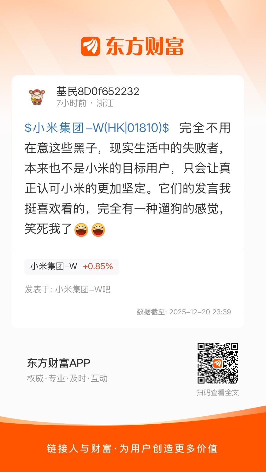 $小米集团-W(HK|01810)$ 完全不用在意这些黑子,现实生活中的失败者,本来也不是小米的目标用户,只会让真正认可小米的更加坚定。它们的发言我挺喜欢看的,完全有一种遛狗的感觉,笑死我了