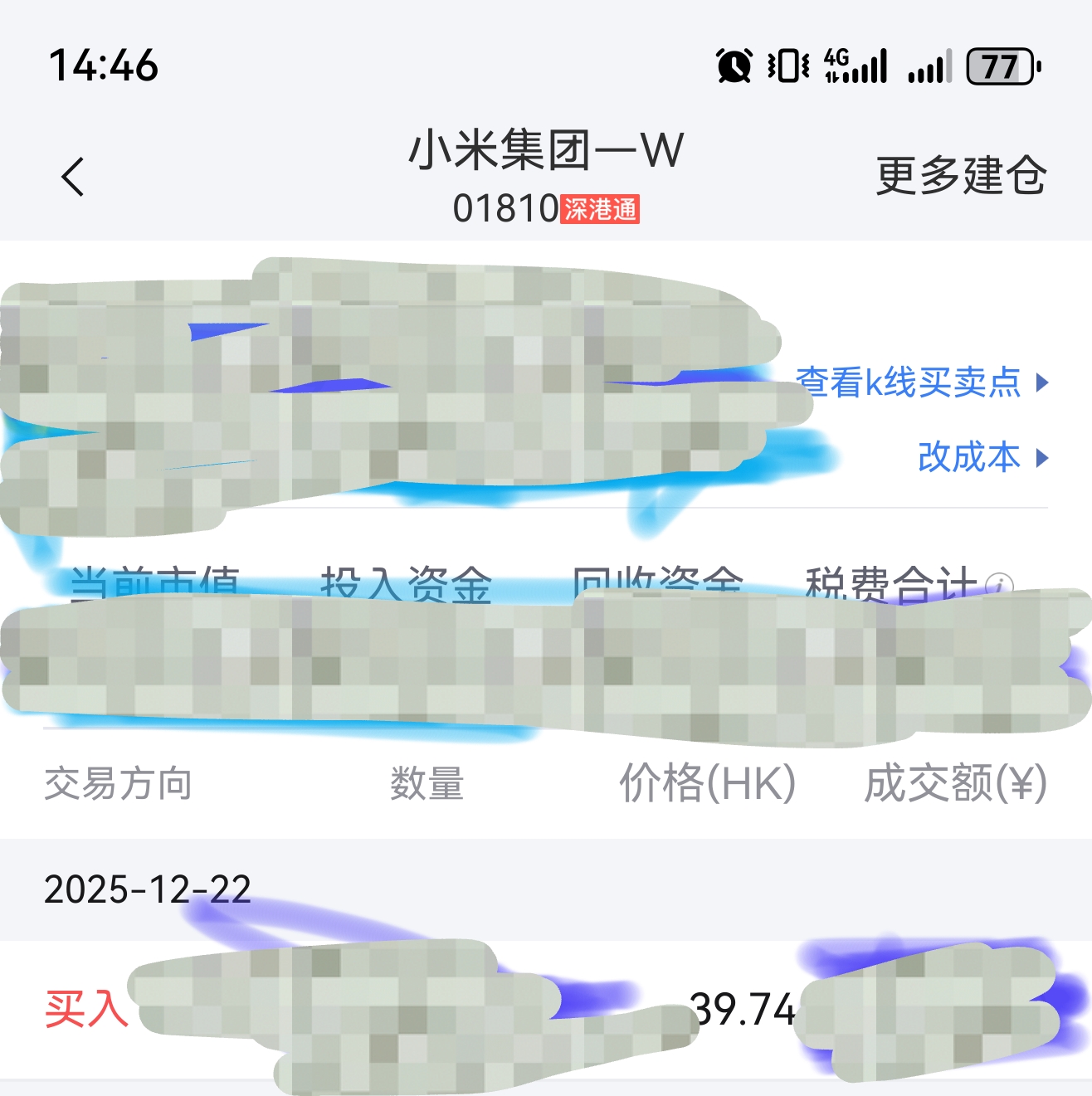 $小米集团-W(HK|01810)$ 今天开贴,39.74买入小米集团,我不做短线,长期非常看好小米集团。你们不看好有你们的理由,反对的,你们就去尽情做空好了。我的第一目标位置75元,时间在2026年10月份,第二目标在105时间在2028年10月份,第三目标位置155,时间在2030年9月前后。发此帖开始,持续逢低建仓,40以下逢低分布买入。记录于2025年12月22号