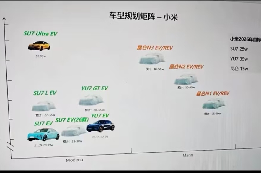 今天都在传这张图,小米汽车明年的产品矩阵全家桶要来了,包括了小米su7和su7L