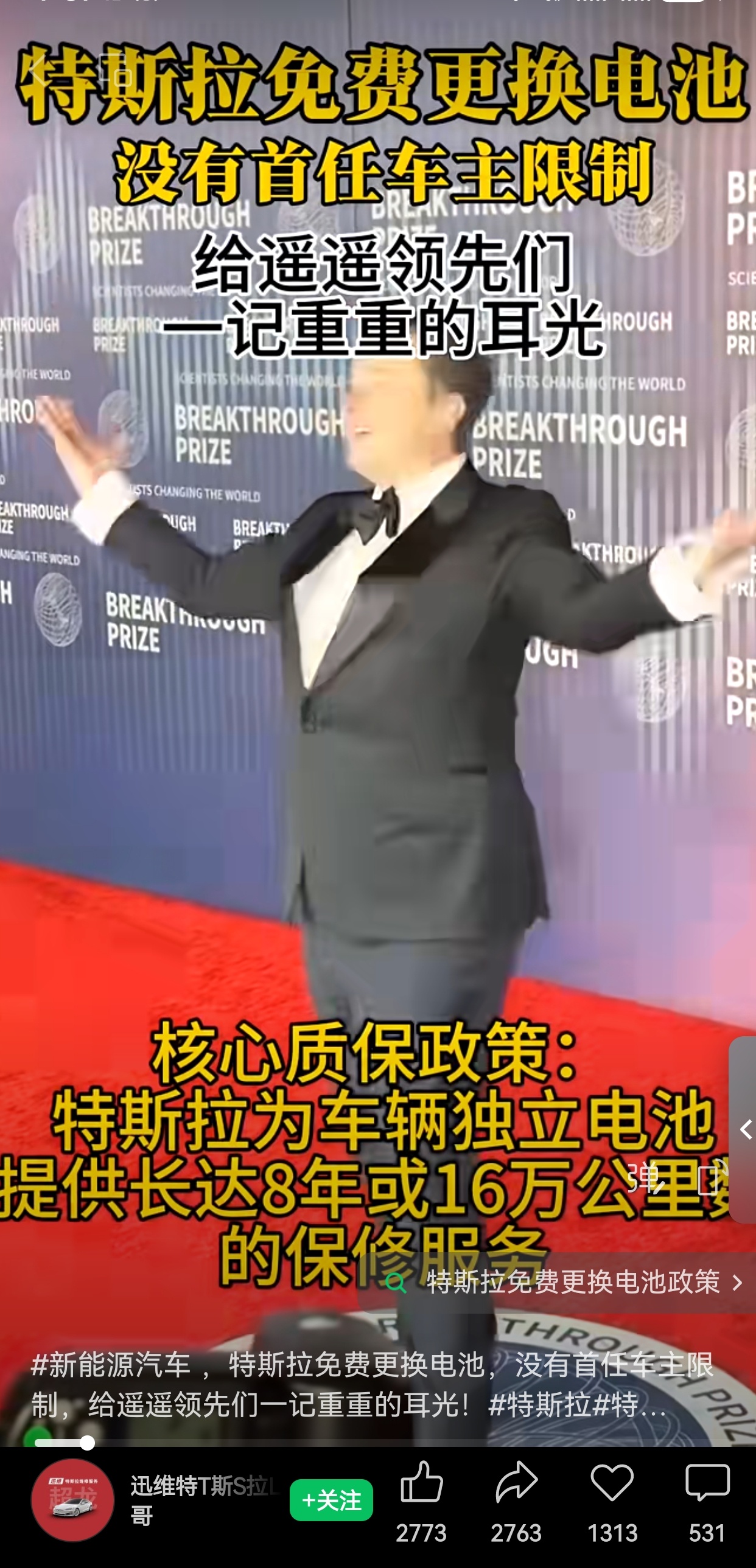 $小米集团-W(HK|01810)$ $赛力斯(SH601127)$ $比亚迪(SZ002594)$ 特斯拉免费更换电池,巨大冲击波。国产电动车股价,都得下台阶。相对,比亚迪影响小,比亚迪电池也是自己生产的,大不了,跟进。