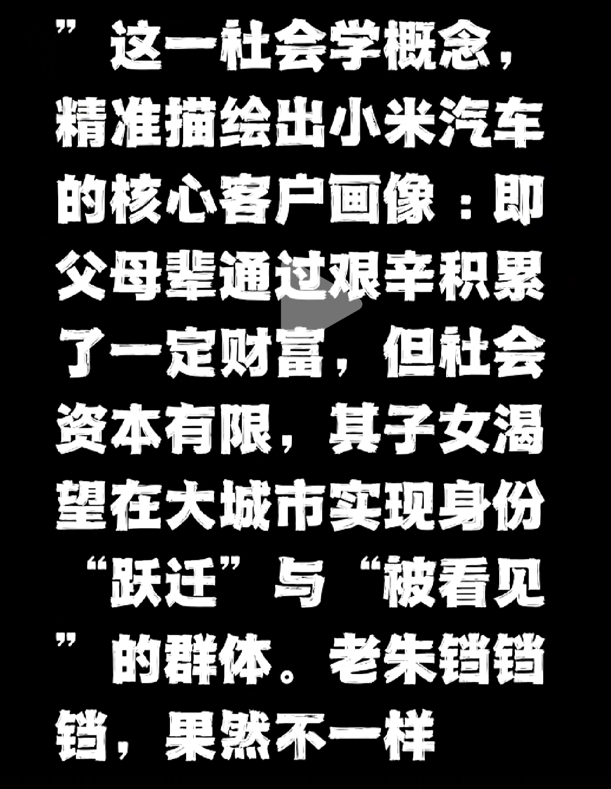 “苦二代”这一社会学概念,精准描绘出小米汽车的核心客户画像:即父母辈通过艰辛积累了一定财富,例如做小餐馆,批发市场,但社会资本有限,其子女渴望在大城市实现身份“跃迁”与“被看见”的群体。