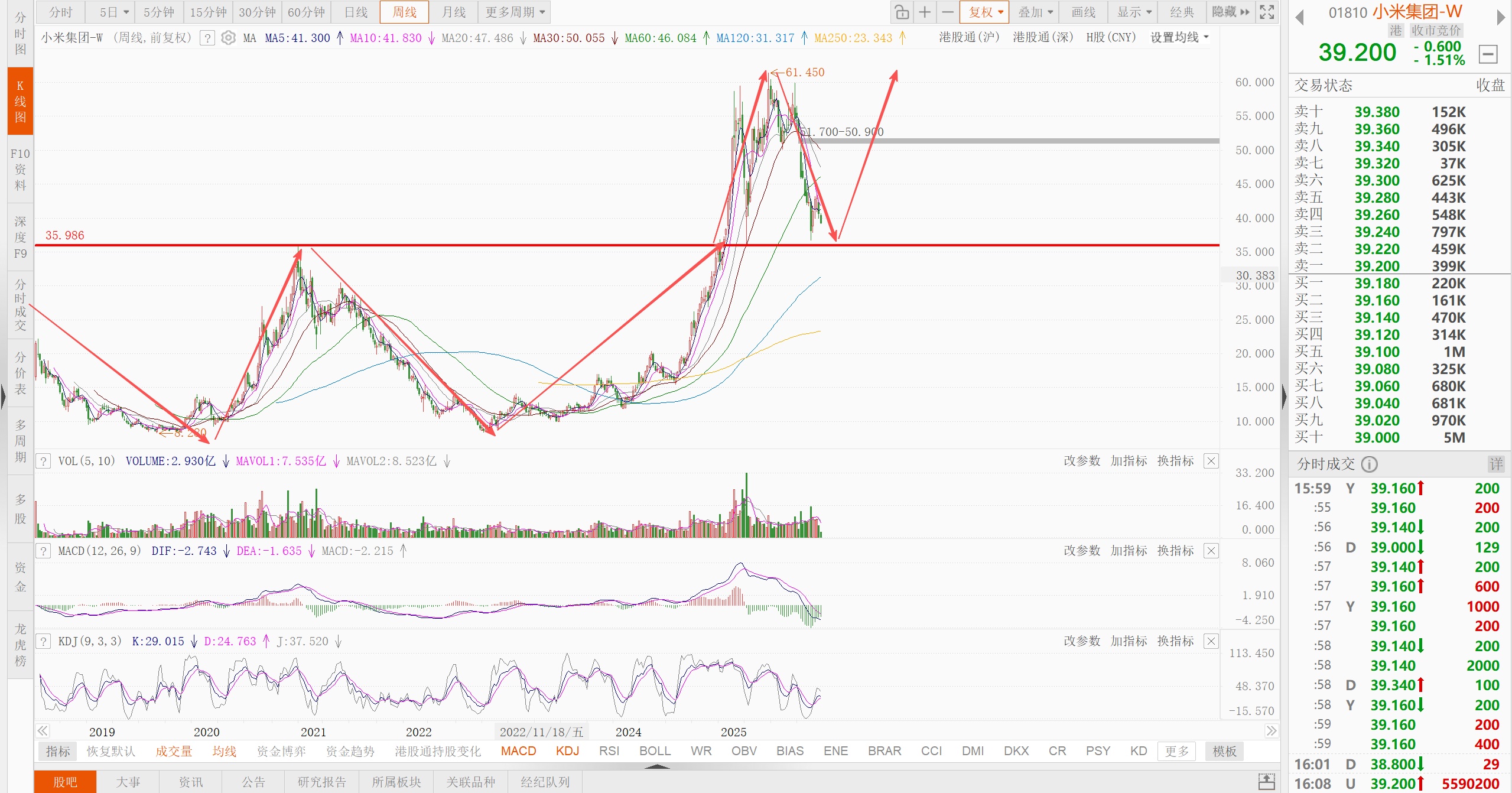 $小米集团-W(HK|01810)$ 周线级别突破W颈线位后回踩颈线位确认的一个过程?相信就干一票,2026年完成36-61元70%的收益率足矣