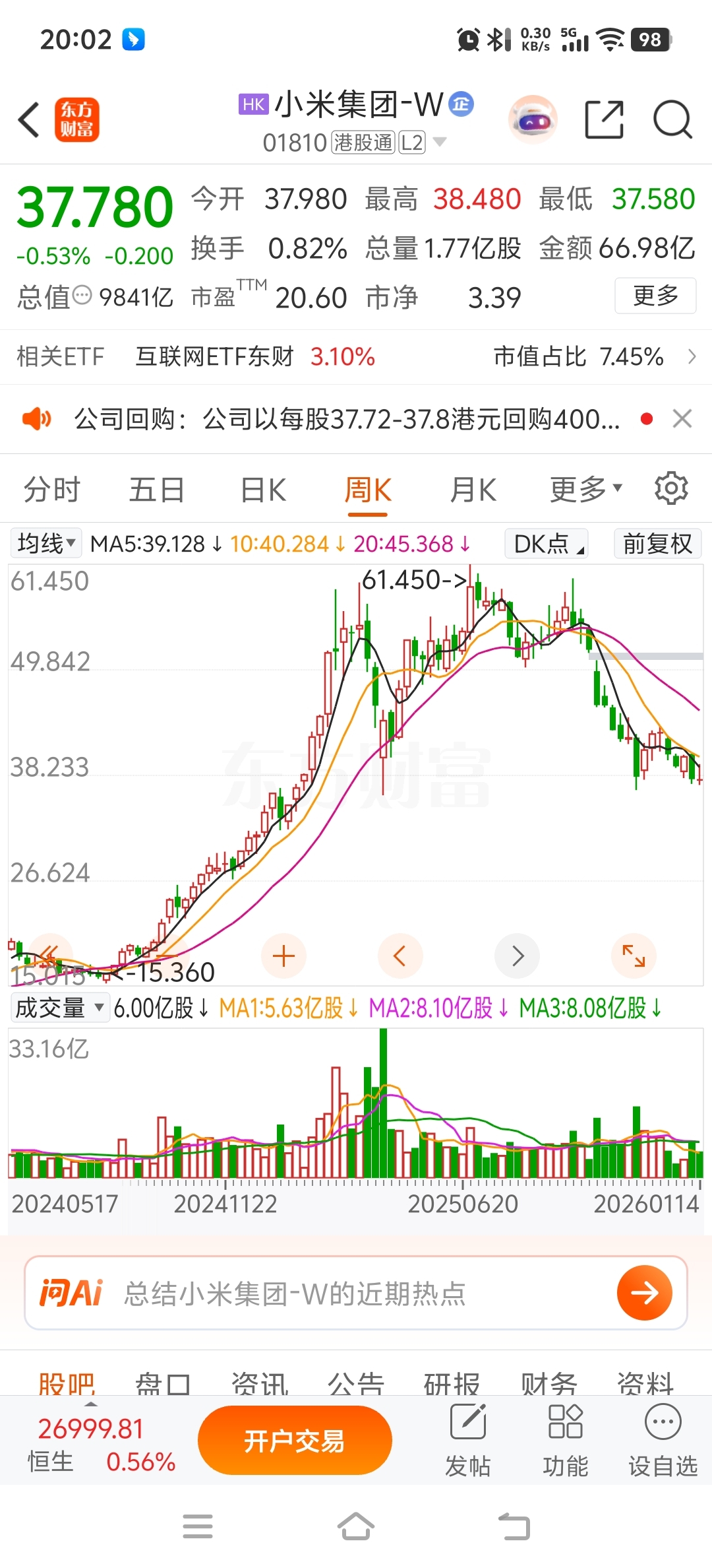 $小米集团-W(HK|01810)$ 我看到这走势我都想笑,我就知道当小米最火的时候股票基本被抄到高点,那个时候不知道多少散户买,雷总大火那段时间,billbill有个人说自己全仓买了,我还劝他现在热度抄的太高,股价太高了,他说自己炒股这么久还没亏了,挣了多少多少,说坚定持有小米肯定翻倍,一问炒股才一年,说的道理一套一套的,按当初5-60的成本算,现在这小子过年肯定是笑不出来了