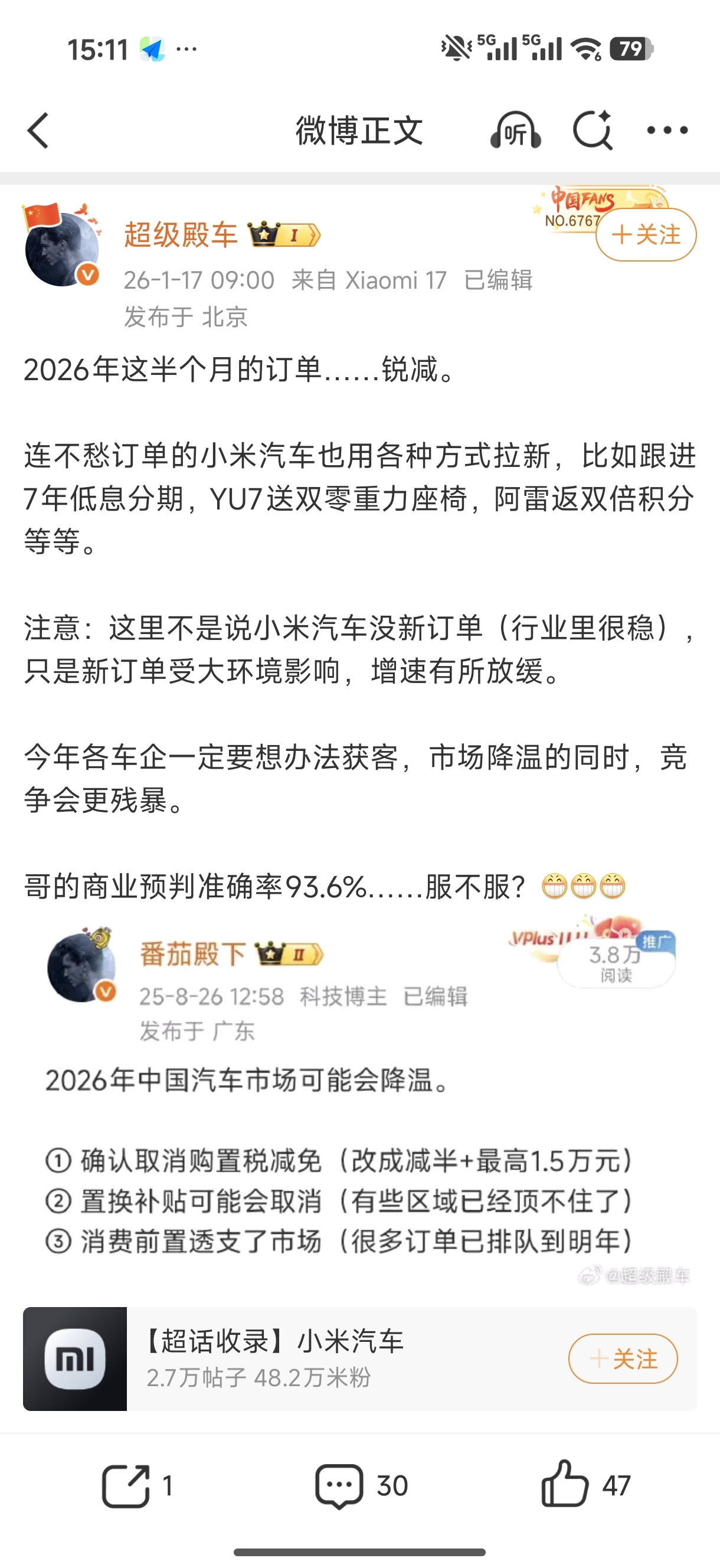 2026年这半个月的订单……锐减。连不愁订单的小米汽车也用各种方式拉新,比如跟进