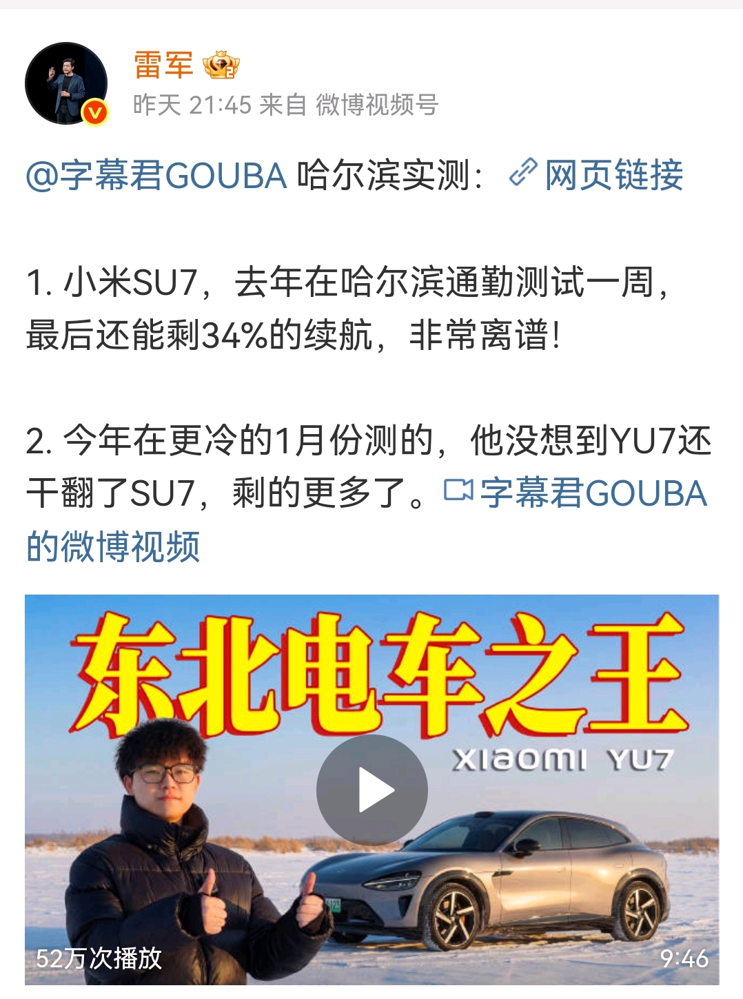 最近,雷总微博宣告,yu7极寒续航测试,在通勤测试后,yu7剩余的比SU7还多!据悉小米SU7去年在哈尔滨通勤测试一周,最后还能剩34%的续航,这已经非常离谱!这得益于其高效热管理系统和大电池设计,克服了新能源汽车在极寒场景的软肋 。比亚迪,小鹏们敢不敢极寒场景碰一碰!