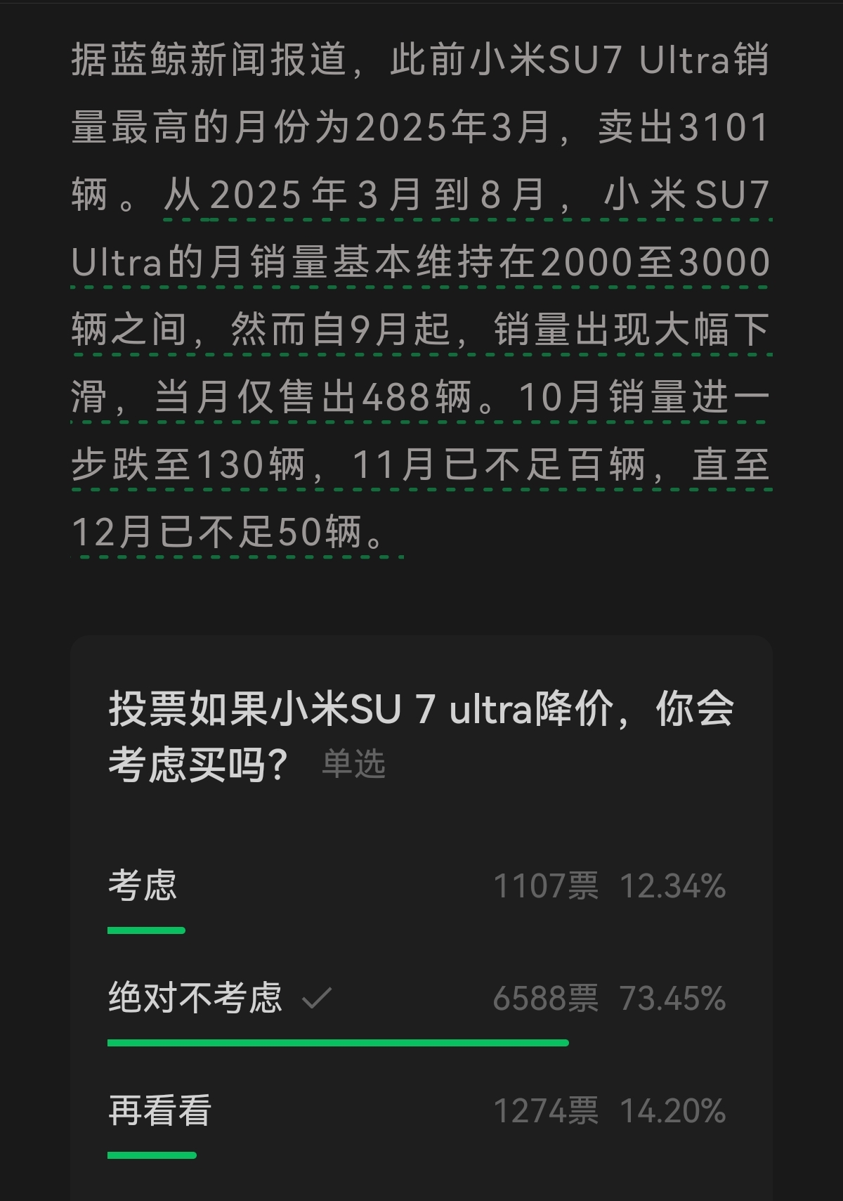 $小米集团-W(HK|01810)$ Su7 Ultra 12月销量跌至45台