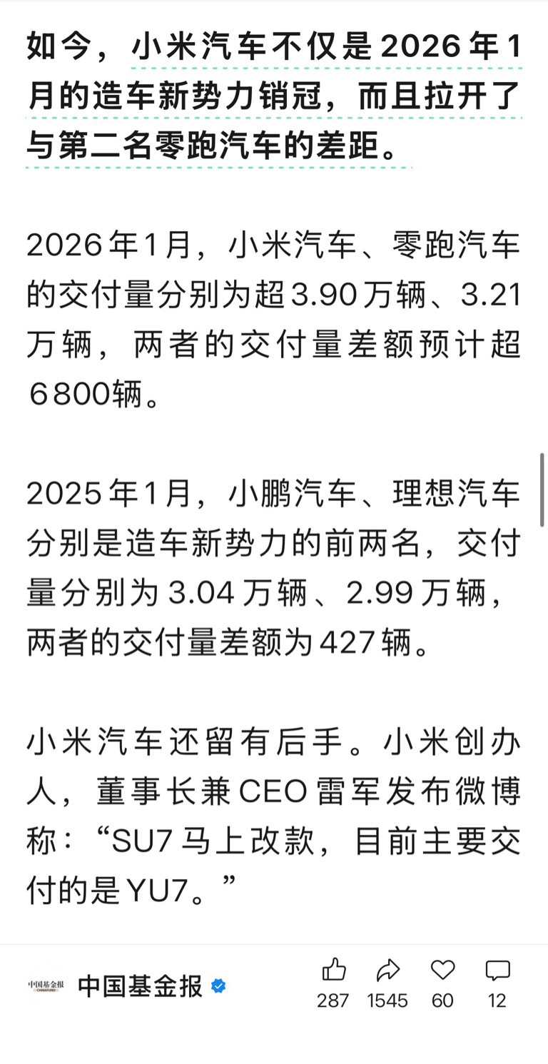 如今,小米汽车不仅是2026年1月的造车新势力销冠,而且拉开了与第二名零跑汽车的