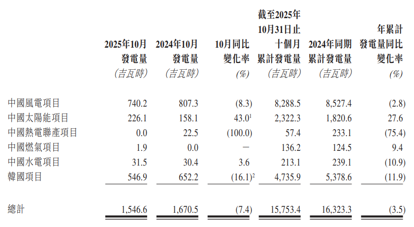 中广核新能源10月发电量同比降7.4% 前10月累计下滑3.5%