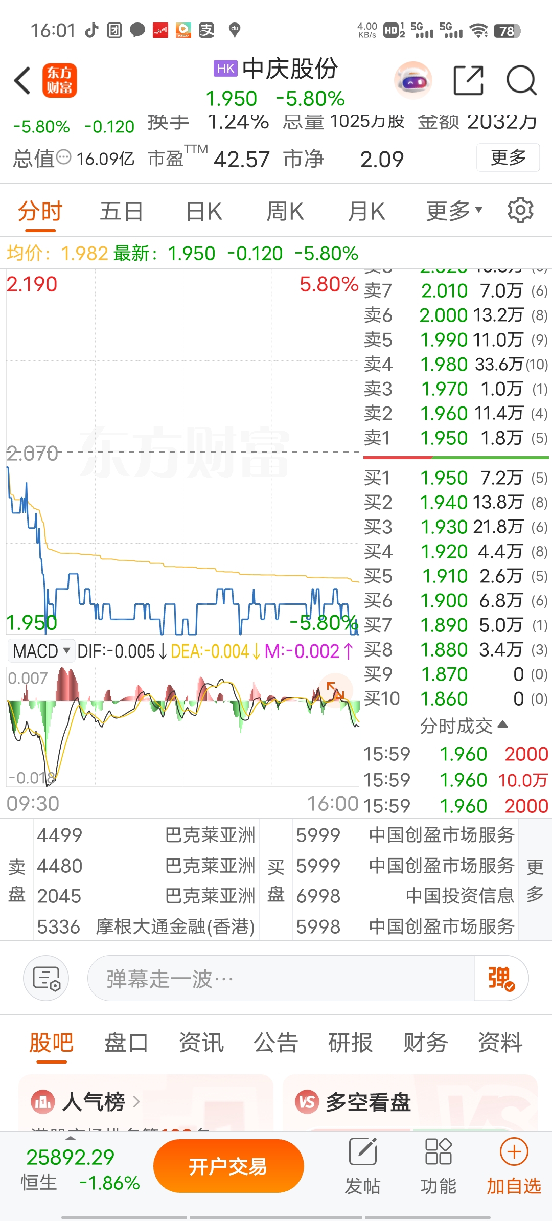 $中庆股份(HK|01855)$ 这么明显的买盘枯竭,2000万就可以砸五个点,还有人在唱多,前几天骂我的人呢,你们亏钱是真不冤枉