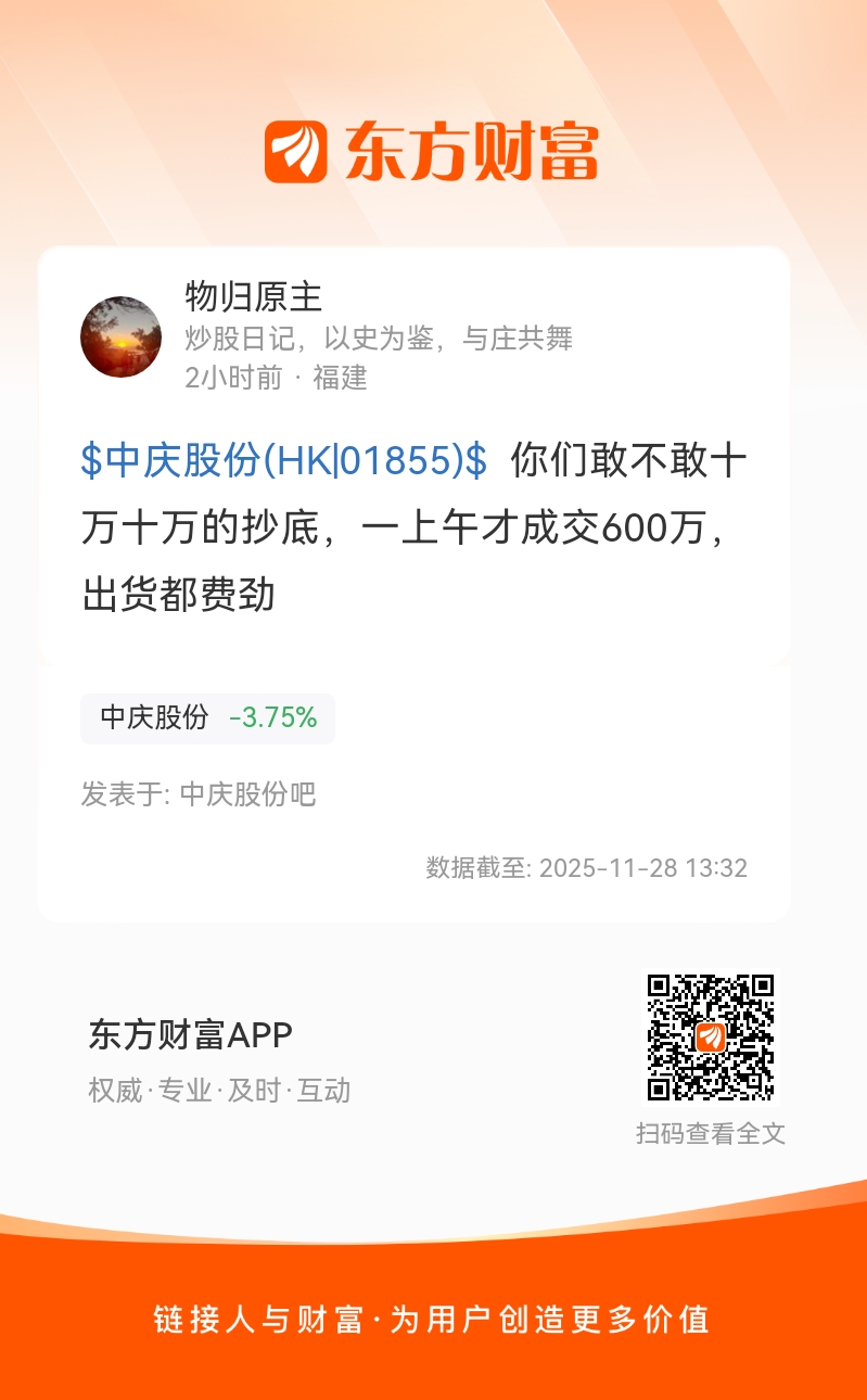 $中庆股份(HK|01855)$  你们敢不敢十万十万的抄底,一上午才成交600万,出货都费劲