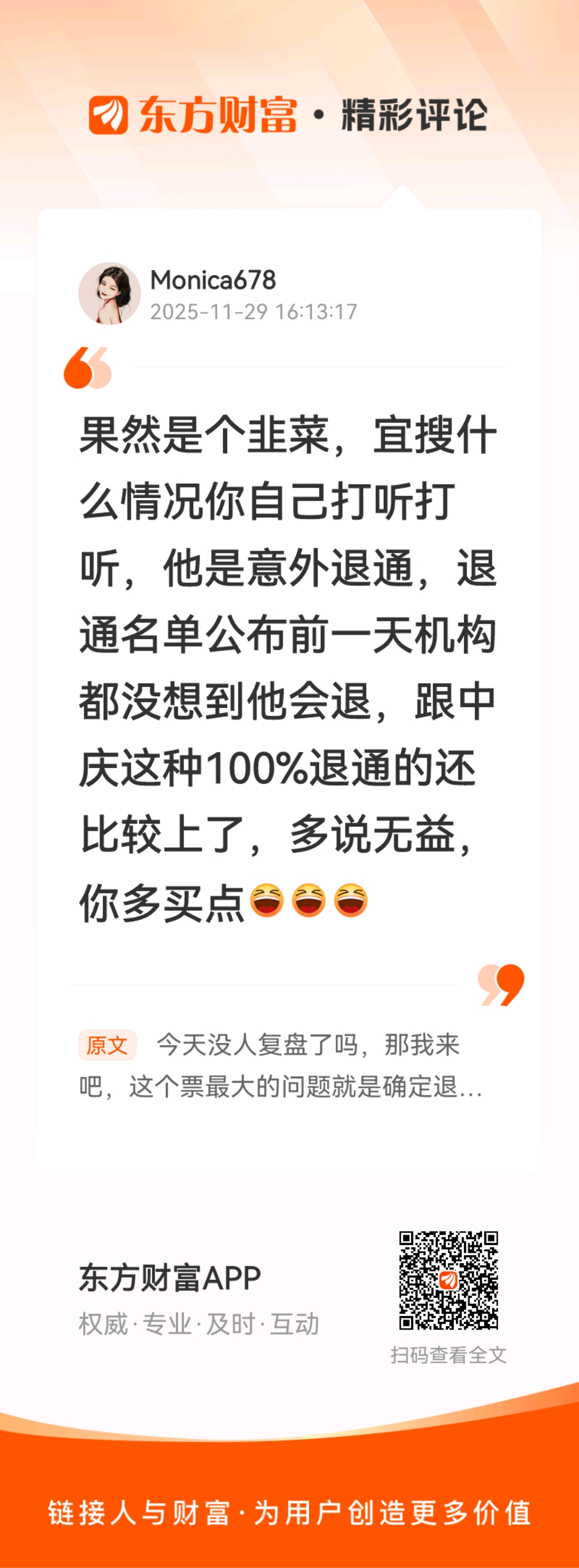 //@Monica678 :果然是个韭菜,宜搜什么情况你自己打听打听,他是意外退通,退通名单公布前一天机构都没想到他会退,跟中庆这种100%退通的还比较上了,多说无益,你多买点