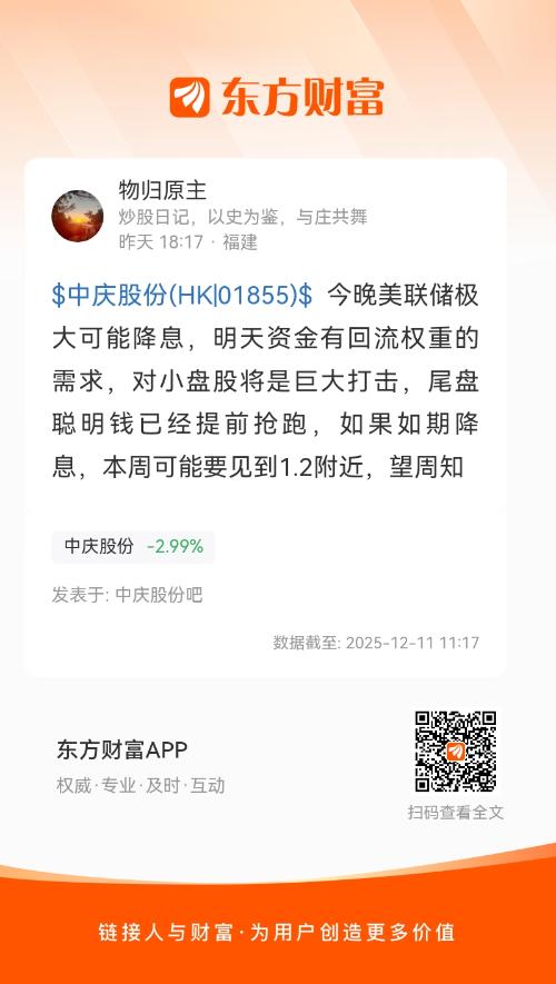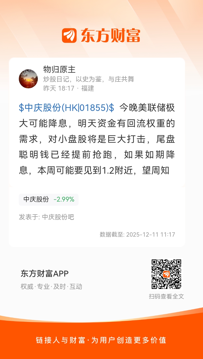 $中庆股份(HK|01855)$ 今晚美联储极大可能降息,明天资金有回流权重的需求,对小盘股将是巨大打击,尾盘聪明钱已经提前抢跑,如果如期降息,本周可能要见到1.2附近,望周知