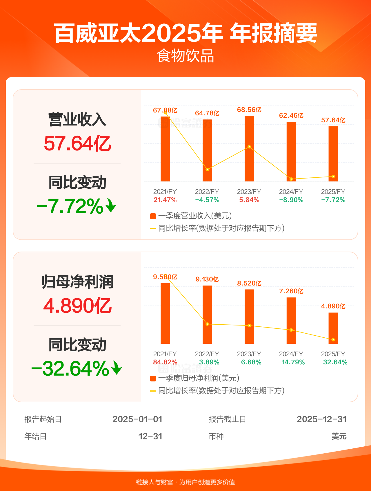 百威亚太2月12日发布年报业绩,截至2025年12月31日的12个月内,该公司营业收入57.64亿美元,同比减少7.72%;公司权益持有人应占溢利(归母净利润)4.89亿美元,同比减少32.64%,低于机构一致预测的6.12亿美元。