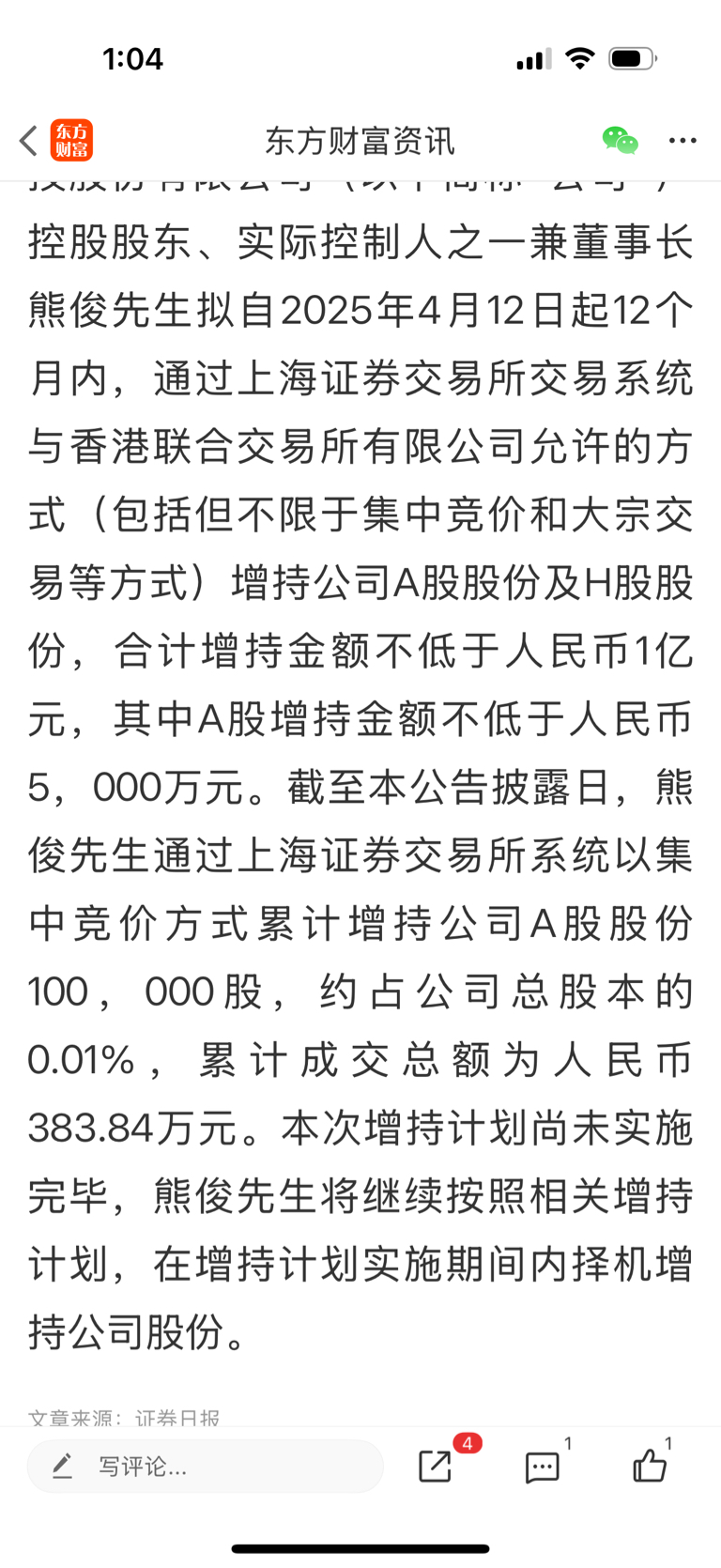 $君实生物(HK|01877)$ 公司控股股东一年过去8个月承诺的增持不少于一个亿,现在8个月过去了只完成300多万,还剩近9700万,一直不动手大概率是觉得现在股价偏高,那就代表后面这只股及有可能暴跌!他能以极低的价格完成增持! 我还差几个点回本就换股,不玩这种有大雷的票