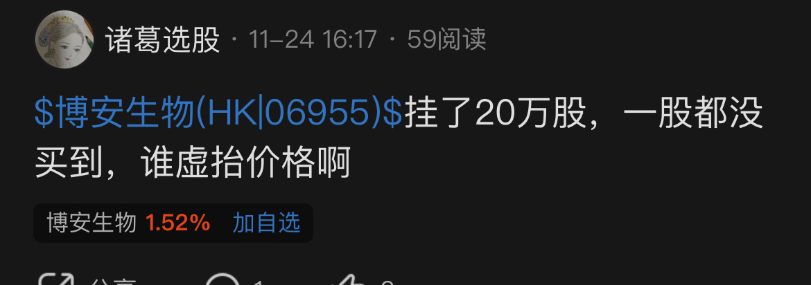 买了君实就要承认自己水平低,我已套三年现在的教训就是君实别补仓,等港股普涨带动。诸葛小套的优点是诸葛能吹,诸葛皮厚,哪都套,哪都要十万股满仓,实际几百股@诸葛选股 $君实生物-U(SH688180)$ $博安生物(HK|06955)$