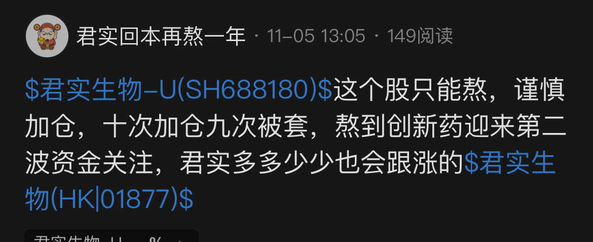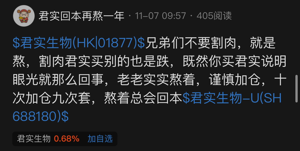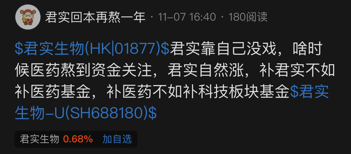 熬到大盘普涨,君实也会涨。君实靠自己,且等着。