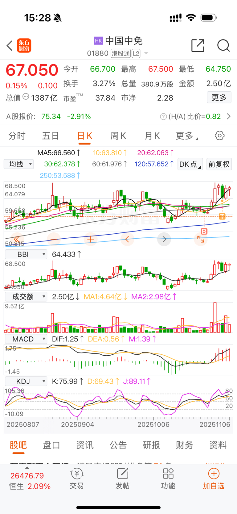 $中国中免(HK|01880)$ 还得是大票,走势稳定不一惊一乍,该反转的时候反转,最近最烦那些中小票了。