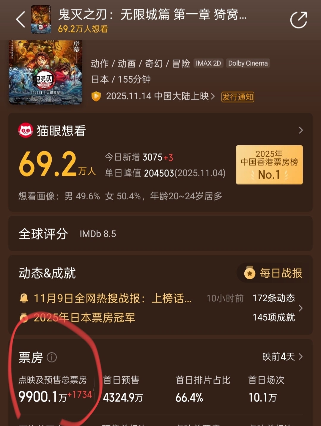 $猫眼娱乐(HK|01896)$ 9900万了,还有100到一亿