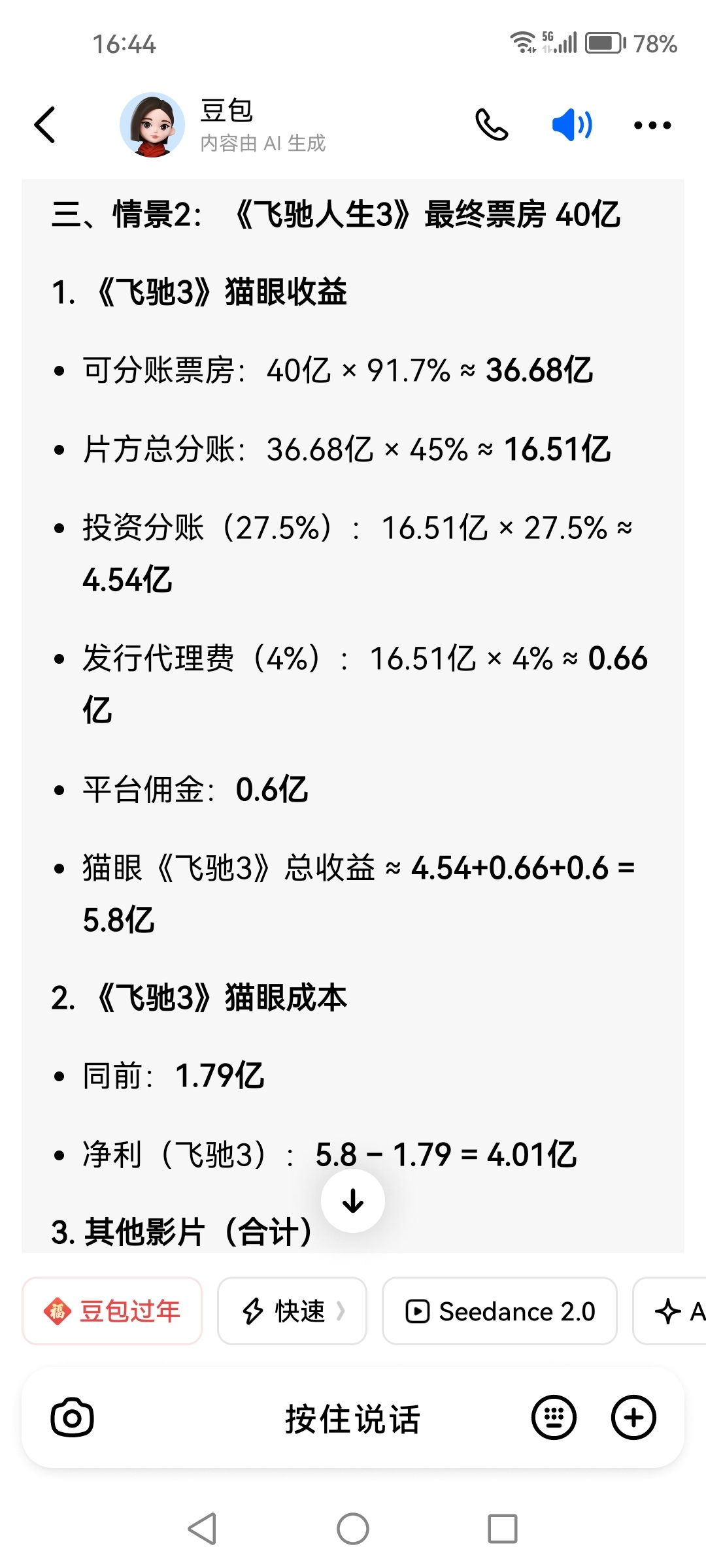 如果按照飞驰3最终票房40亿算的话(到今天初四算已达二十亿),猫眼可以赚4亿。